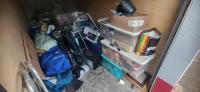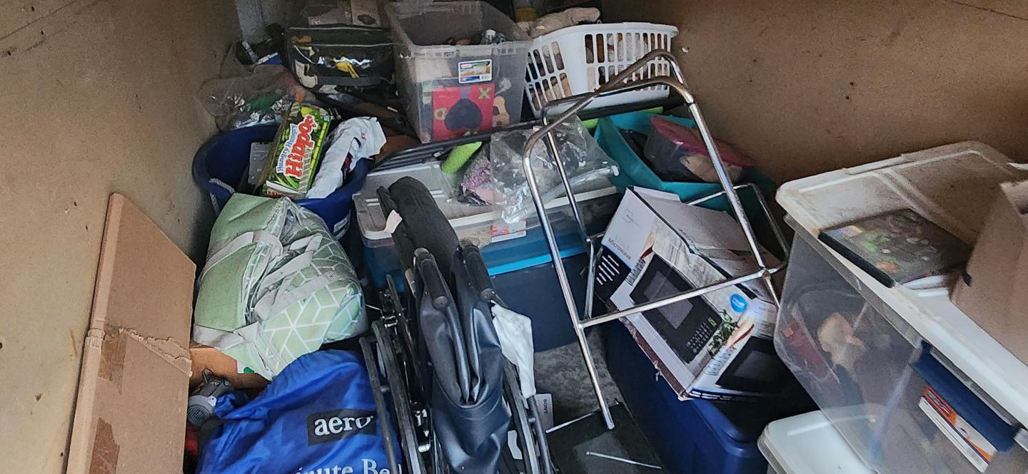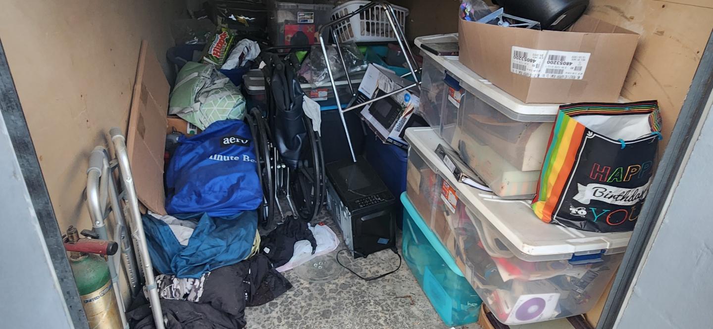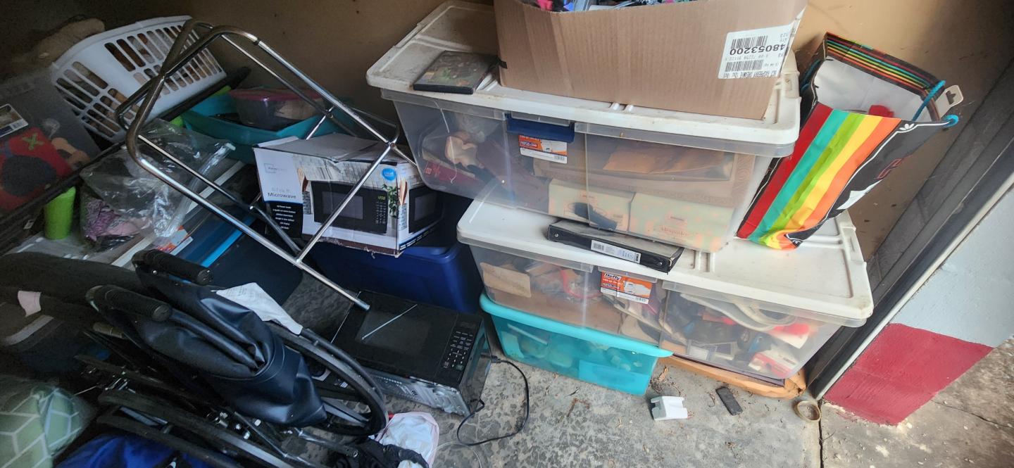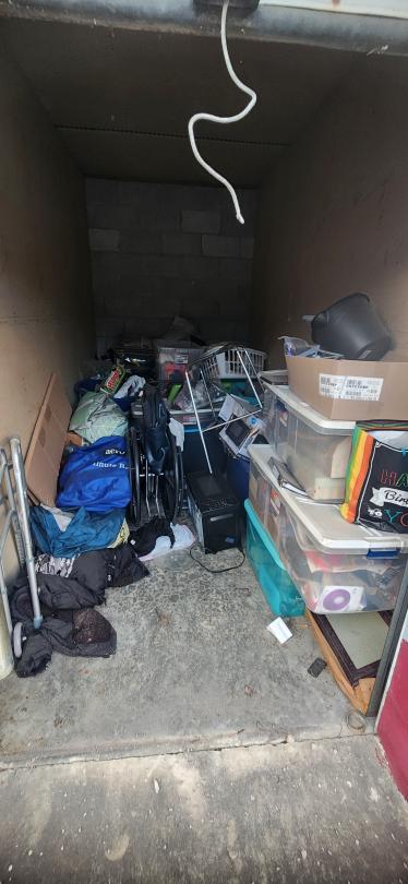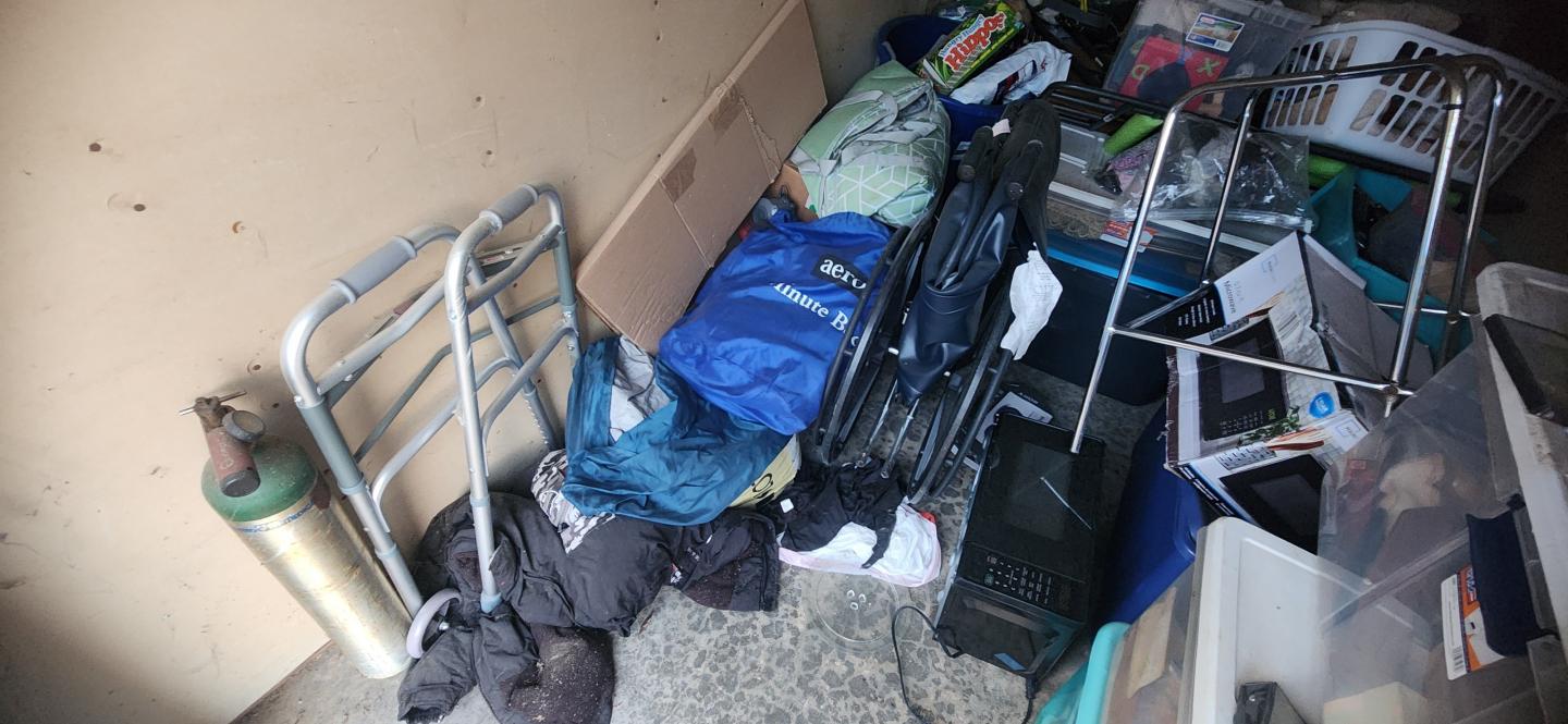 This unit appears to contain…This unit appears to have a wheel chair, walker, clothes, totes with items in them, bucket, comforter, oxygen tank and misc. items!