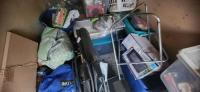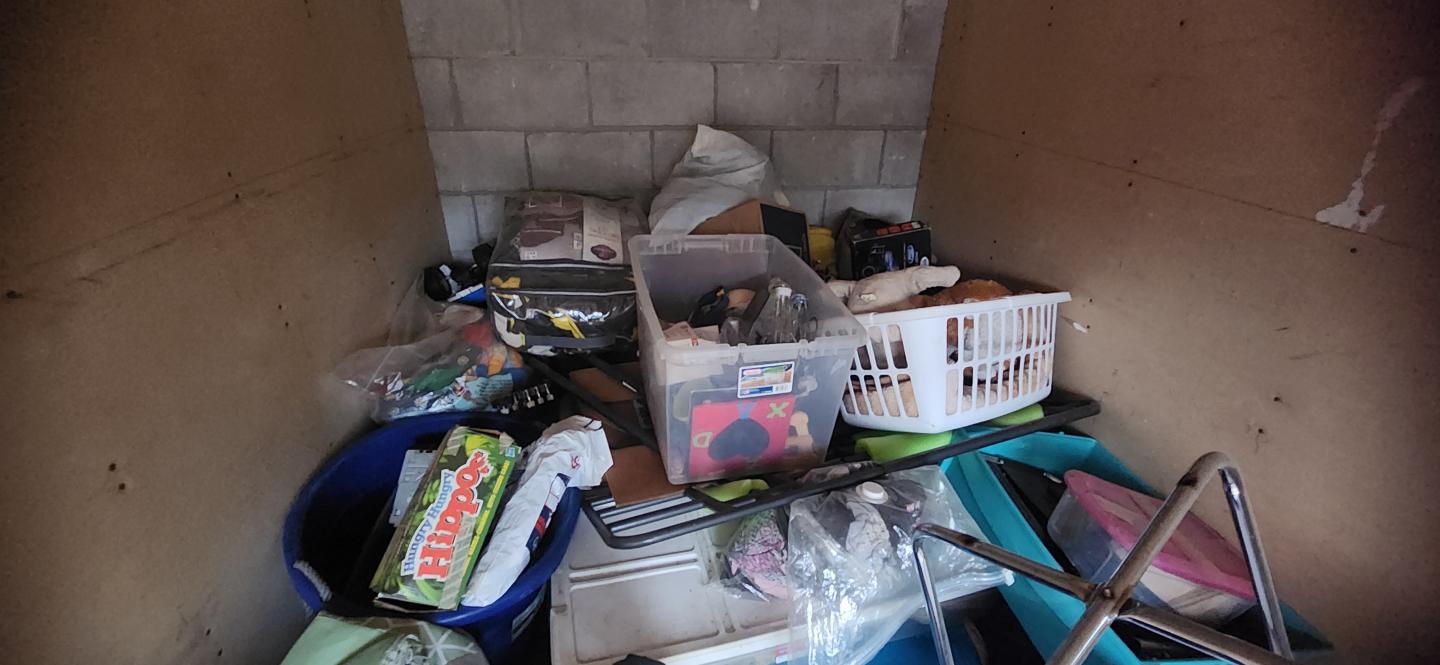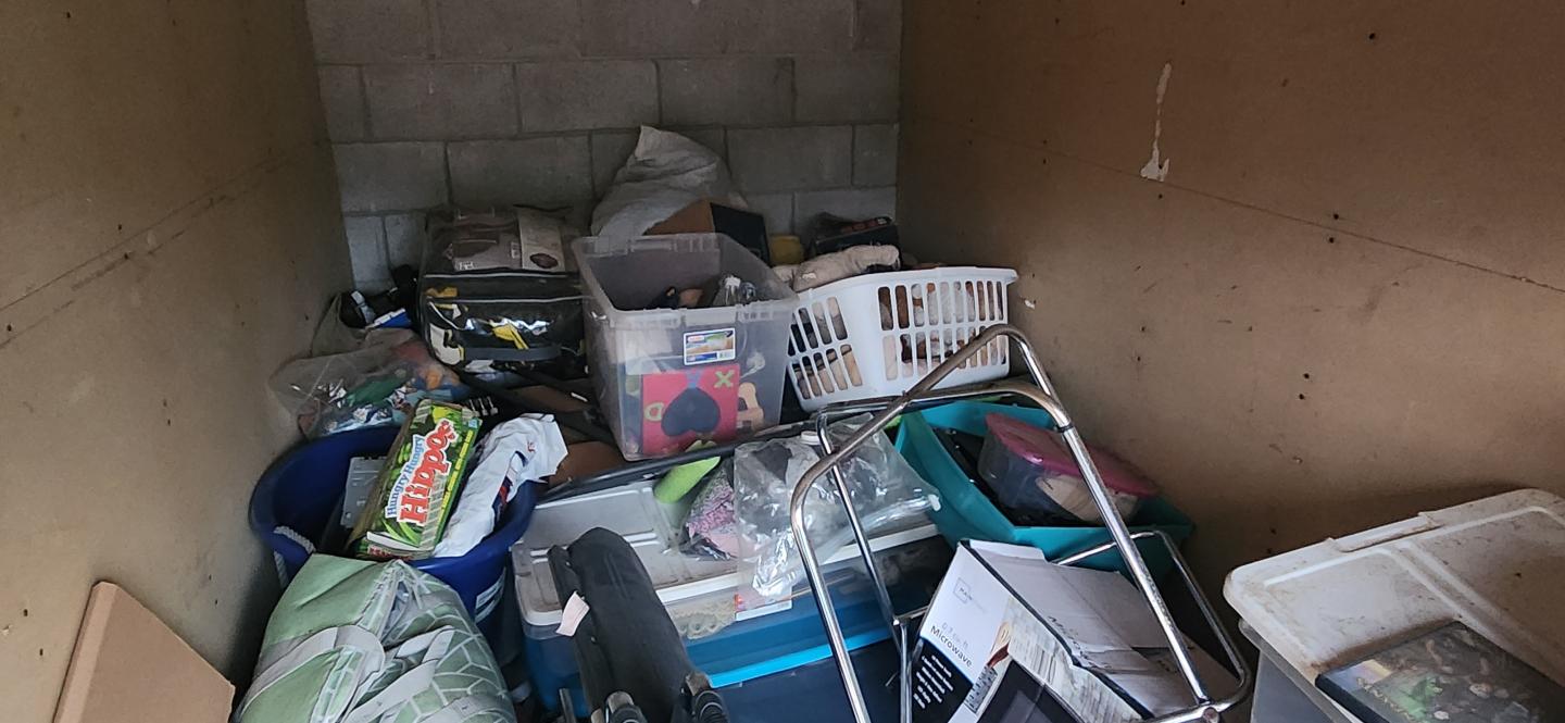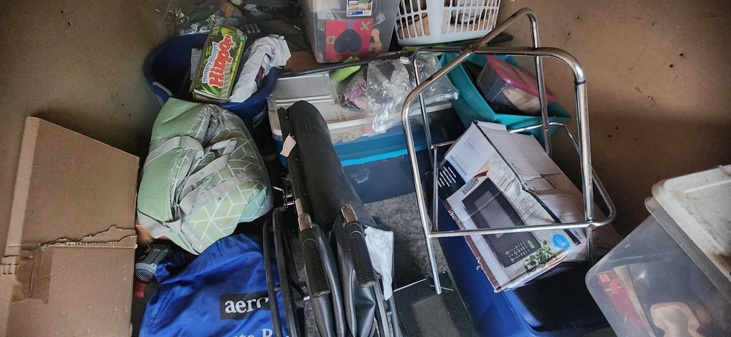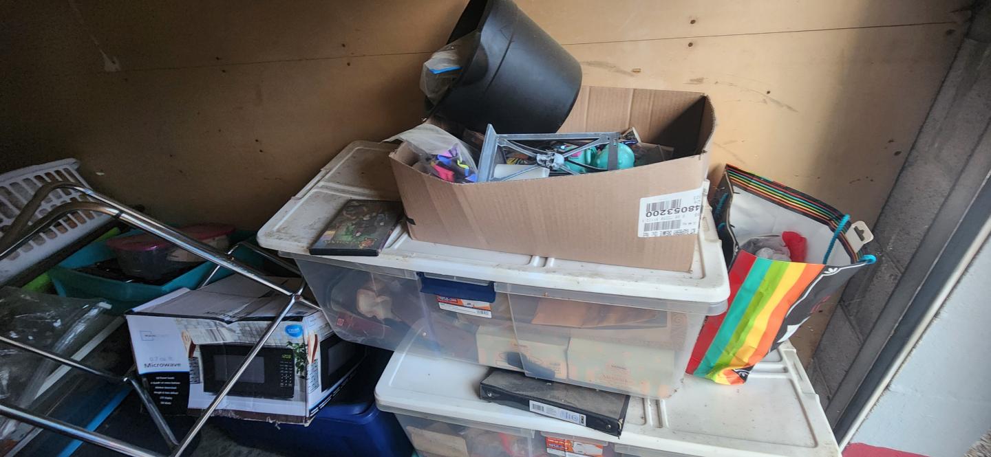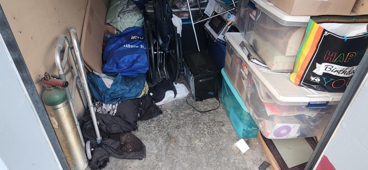 This unit appears to contain…This unit appears to have a wheel chair, walker, clothes, totes with items in them, bucket, comforter, oxygen tank and misc. items!