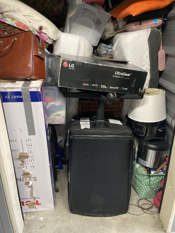 This unit appears to contain…Boxes, Totes, Tv, Household Items, Luggage, Chair