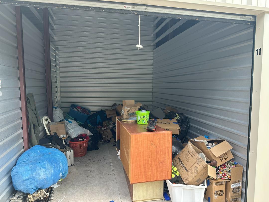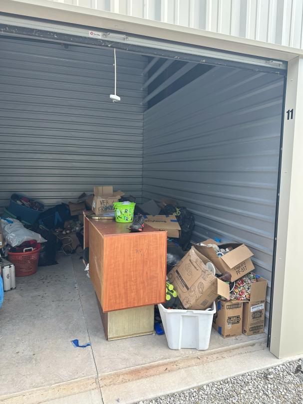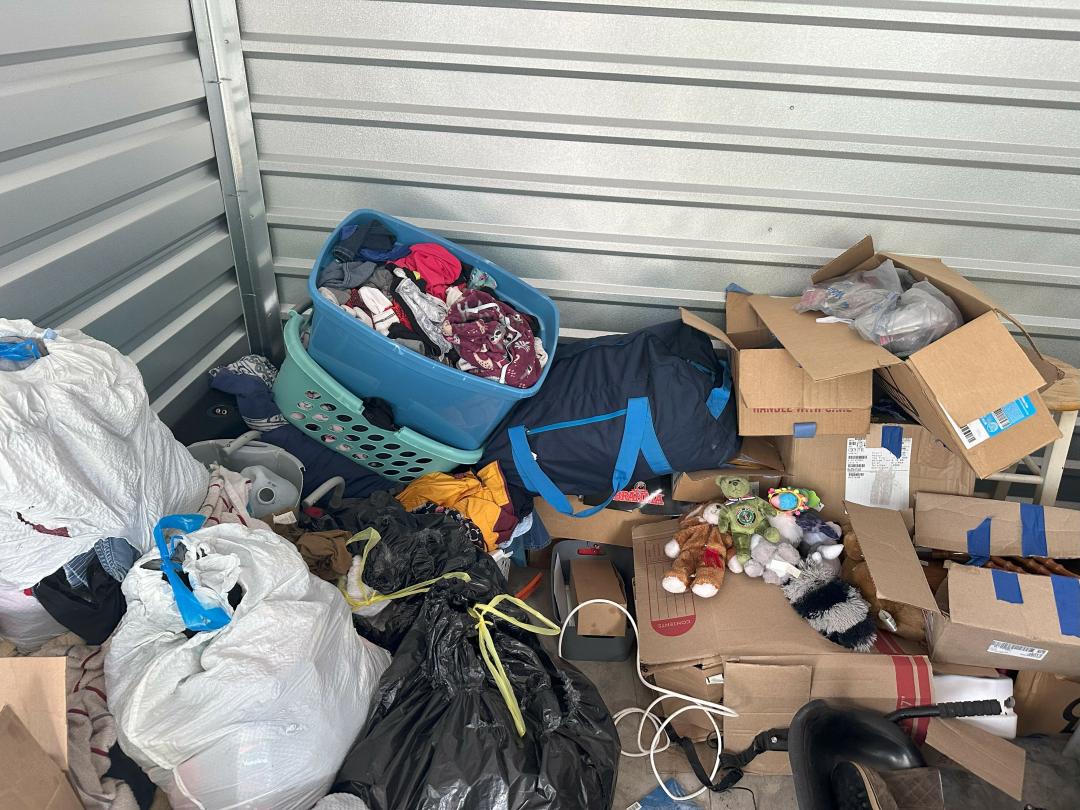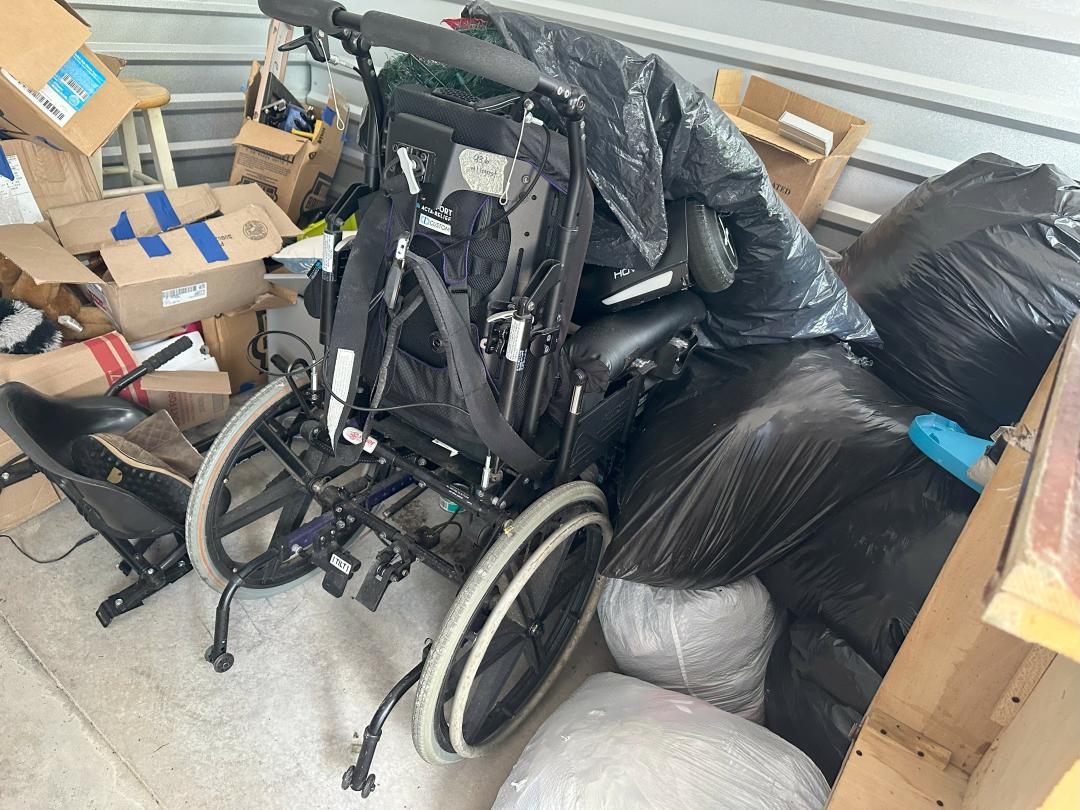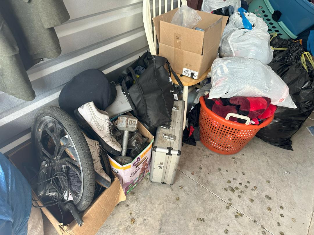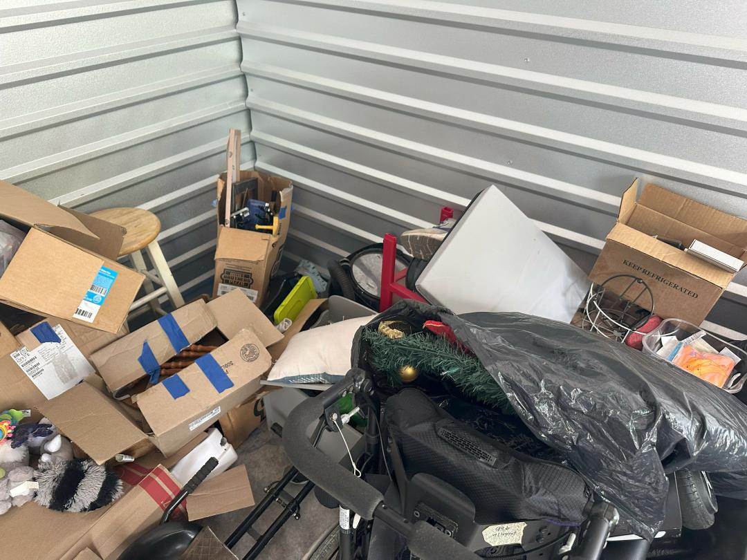 This unit appears to contain…Desk, shoes, wheel chair, boxes, motor, baskets, clothes.