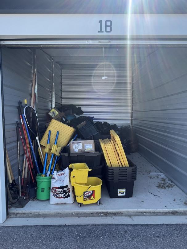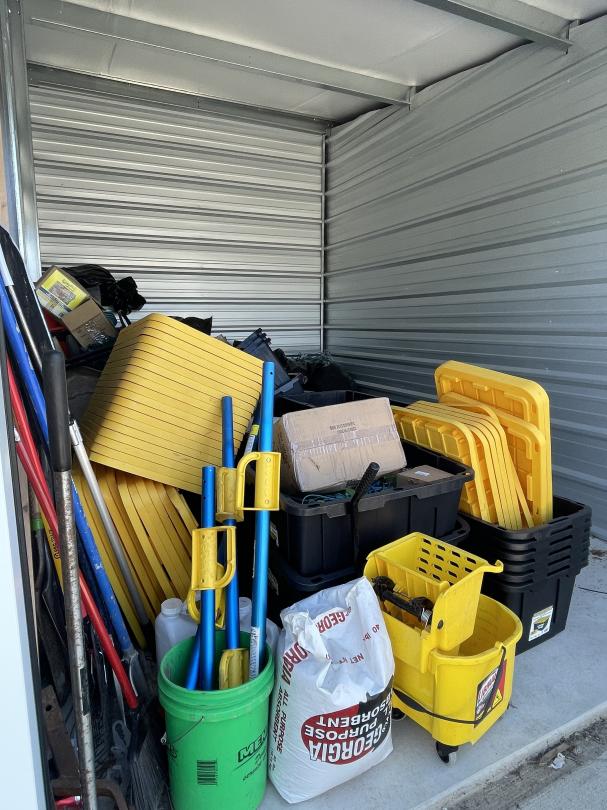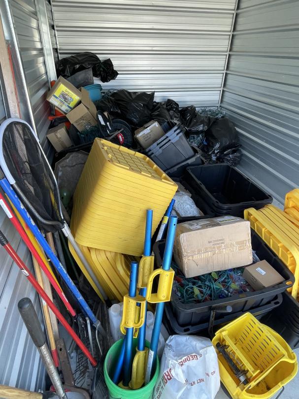 This unit appears to contain…Several boxes, totes and bags of Christmas lights. Gardening and outdoor tools. Empty totes.