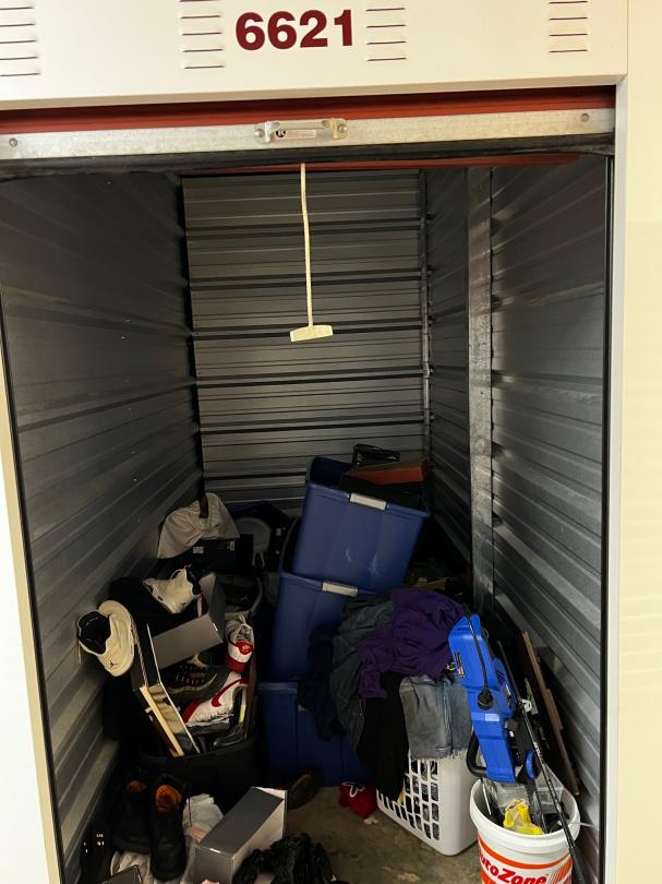 This unit appears to contain…Chainsaw, Laundry Basket, Totes, Fishing Poles, Shoes