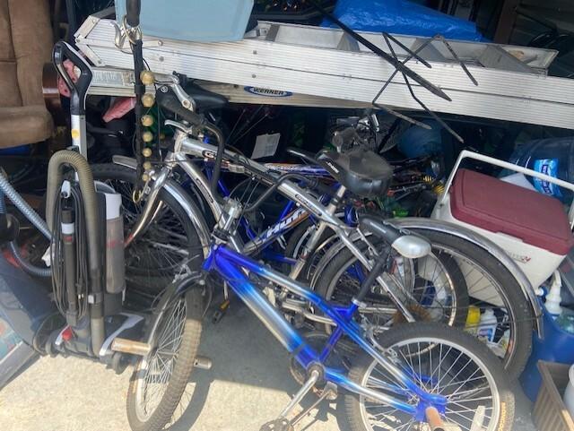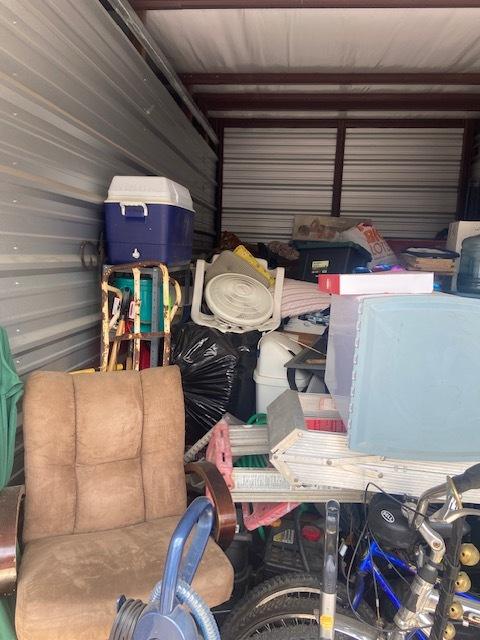 This unit appears to contain…Bikes, boxes, totes, ladders, coolers, vacuum cleaners, chairs, outside umbrella, decorations, miscellaneous household items.