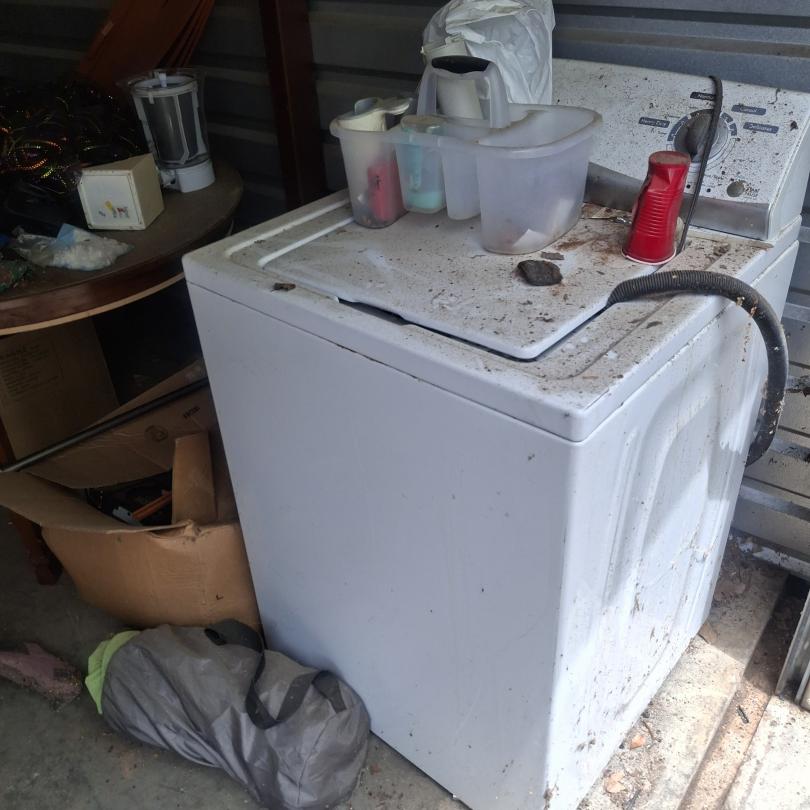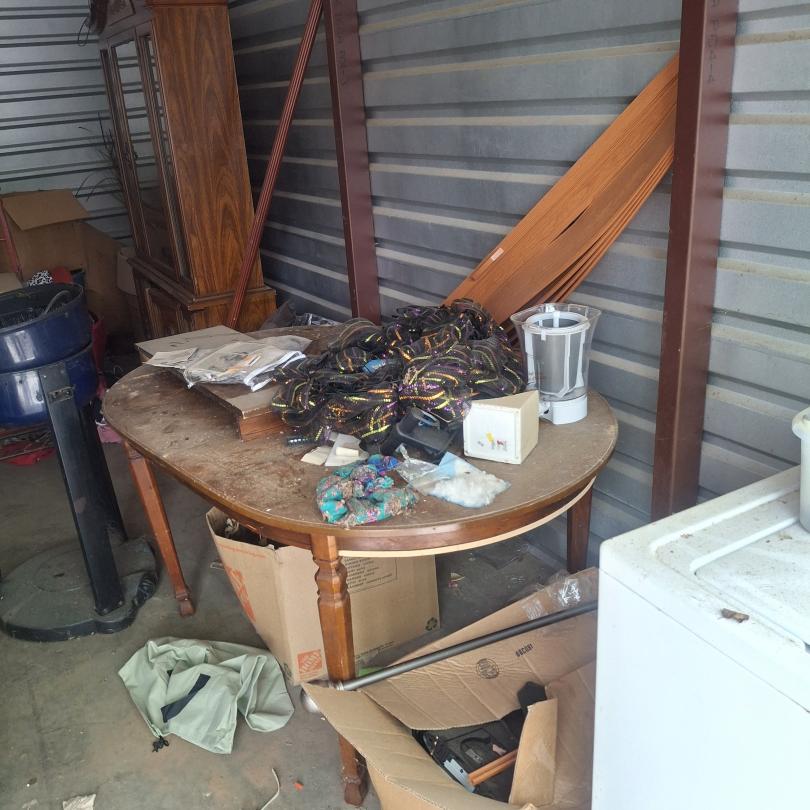 This unit appears to contain…Table, Washer Machine, Boxes, Racks, Decor.
