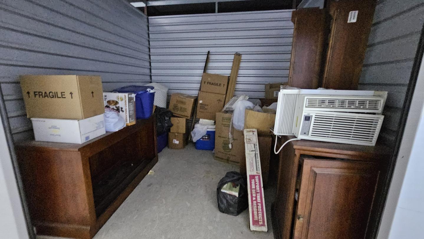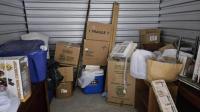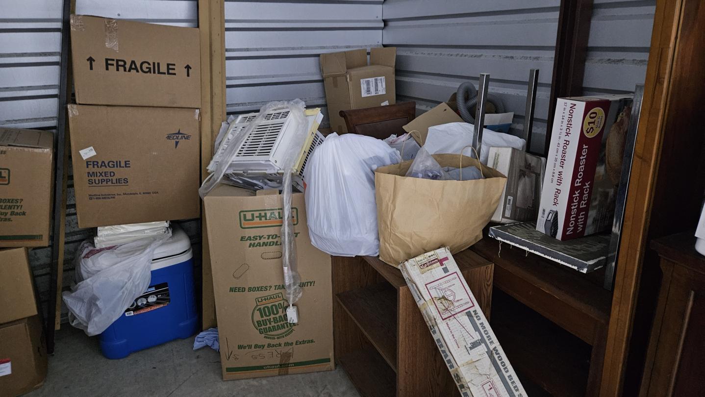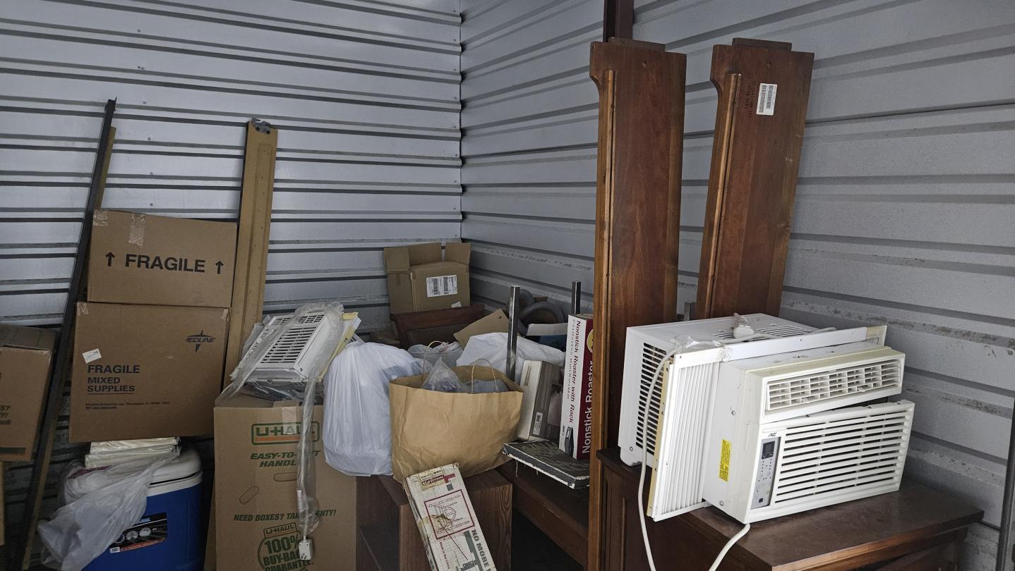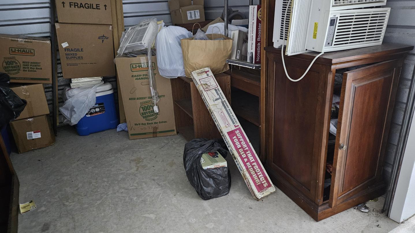 This unit appears to contain…Unit appears to contain window ac units, totes, basket, coolers, bed frame, bookshelf, and boxes.