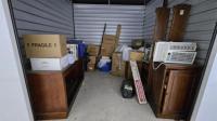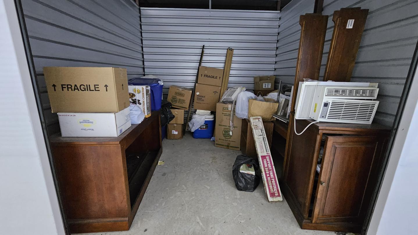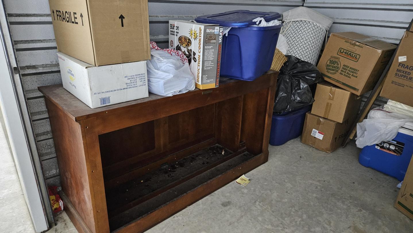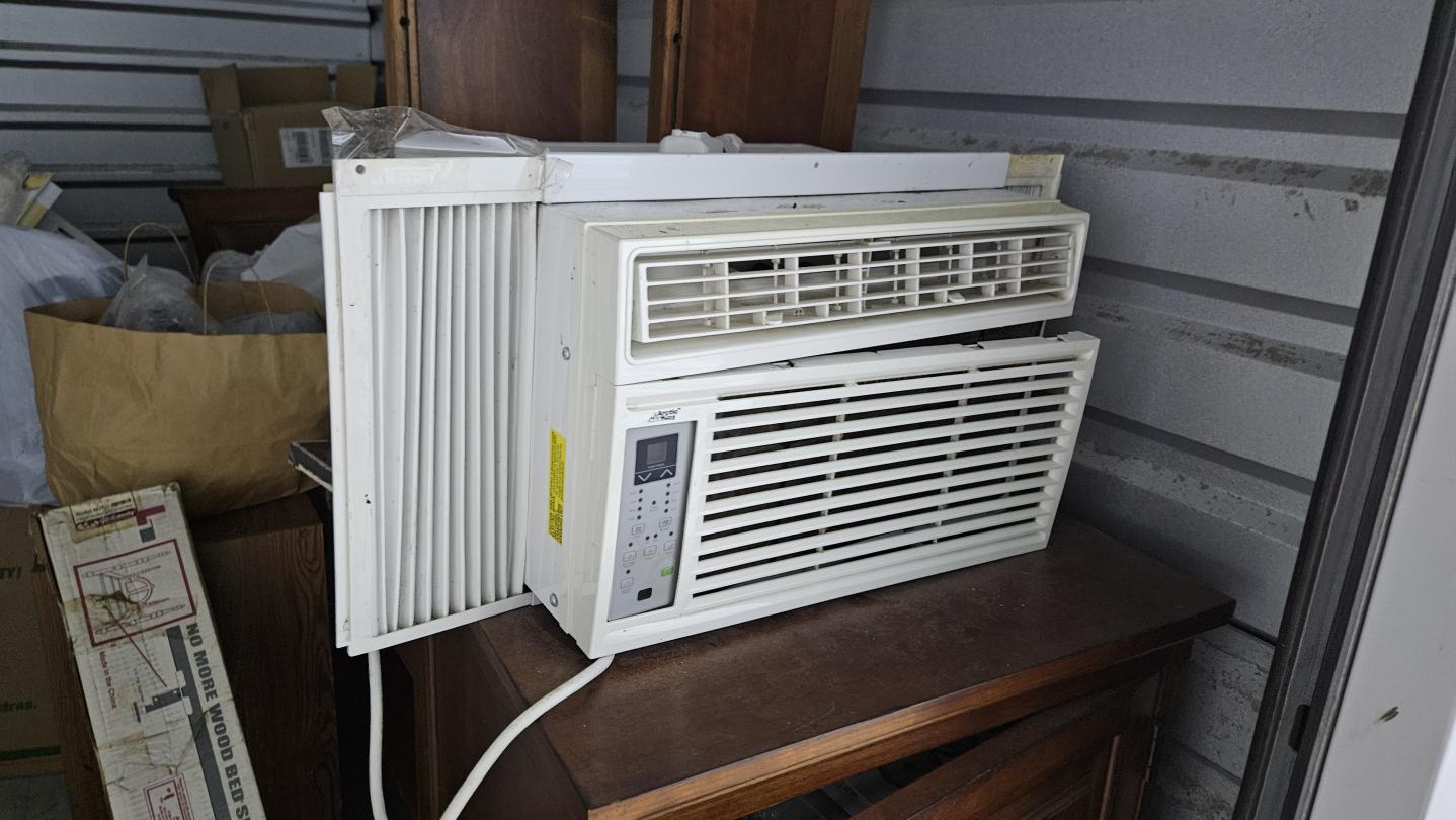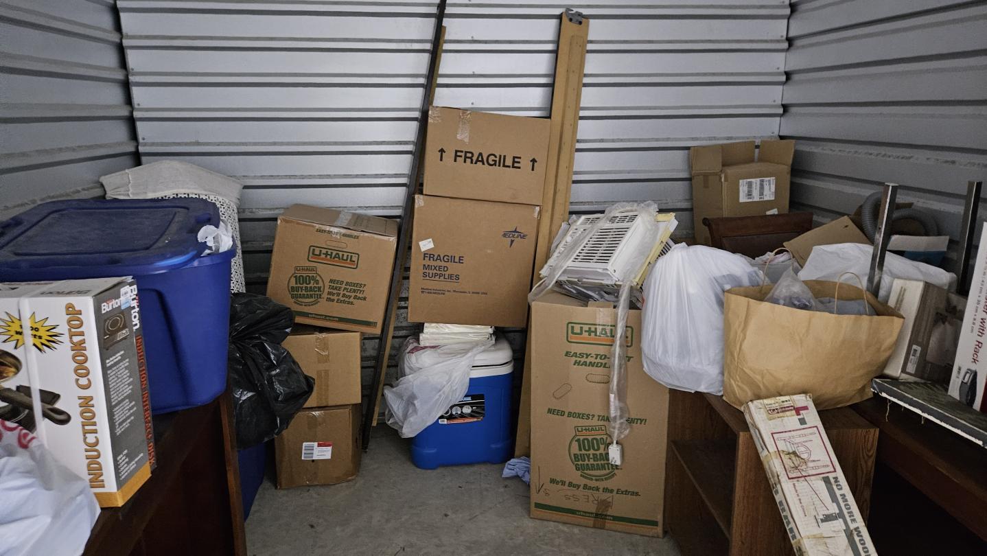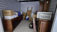 This unit appears to contain…Unit appears to contain window ac units, totes, basket, coolers, bed frame, bookshelf, and boxes.