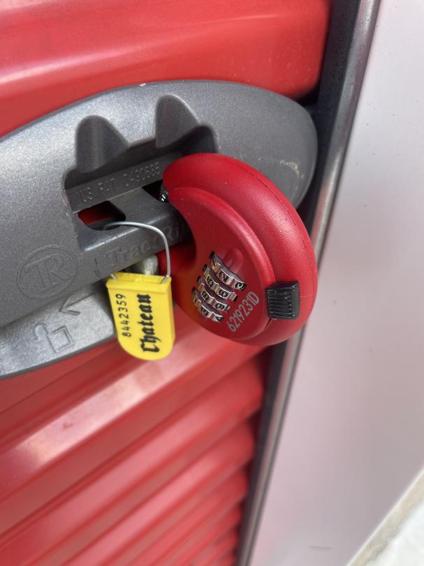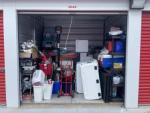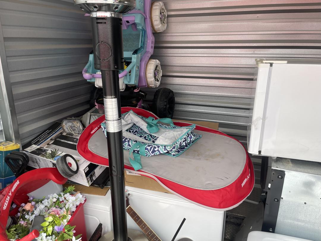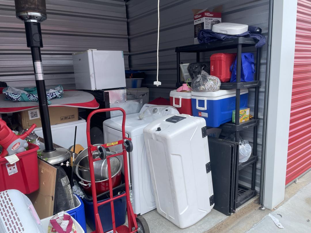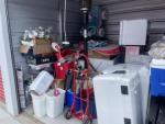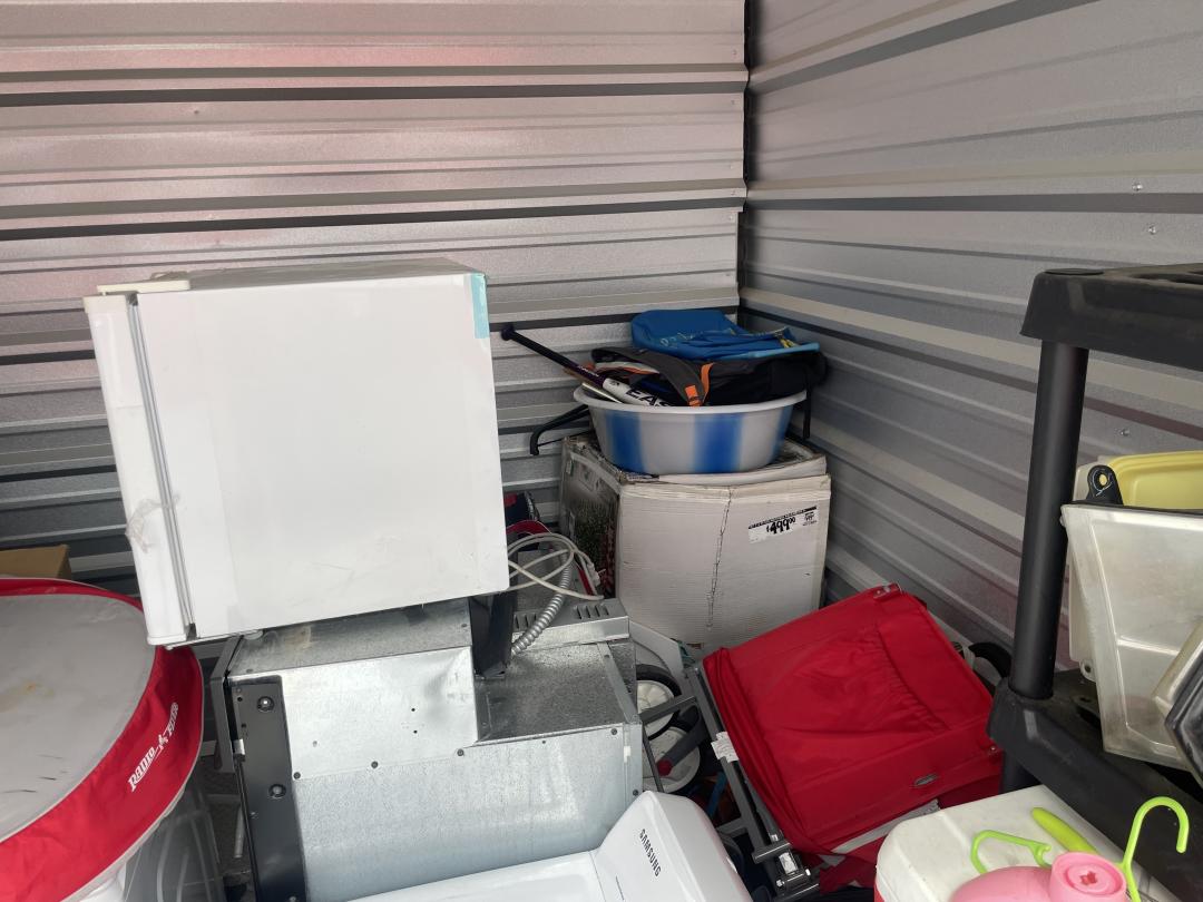 This unit appears to contain…Inventory as follows: shelf units, folding tables, white cooler, samsung dryer, stove, mini fridge, dolley, pots / pans, igloo coolers, standing heating unit, 2 ridable cars (kids), electronics, trash cans, guitar, silk floral stuff, washer(?), dryer (?), and boxes. Could not determine if washer / dryer, appears to be that size, but could not enter unit / disturb things. Red DaVinci Lock ser# 6219231D / 2916 unlock. Yellow Tag Seal ser# 8442359.