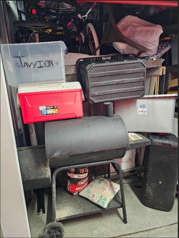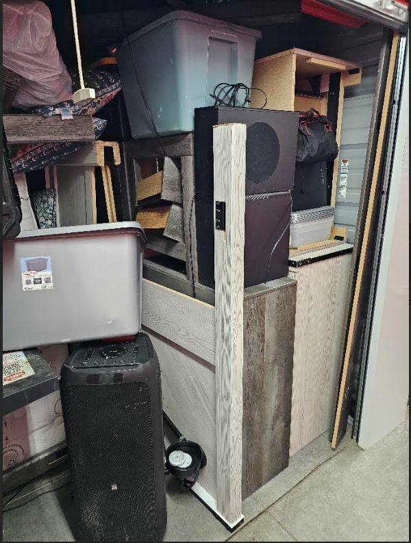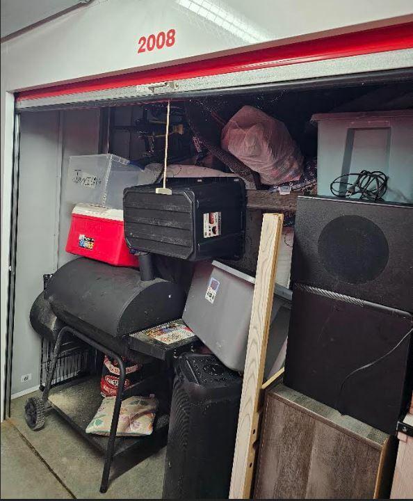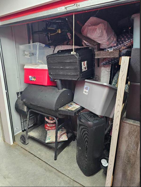 This unit appears to contain…HOUSEHOLD GOODS, BIKES, GRILL, SPEAKERS, FURNITURE, BINS, BOXES, MISCELLANEOUS AND PERSONAL ITEMS