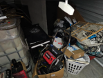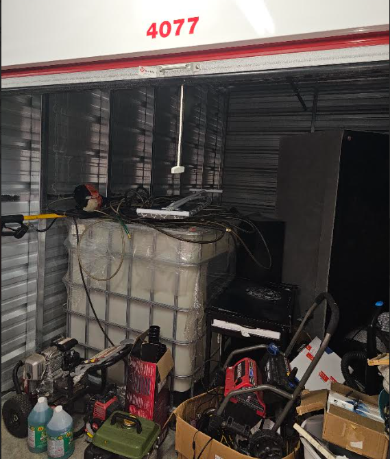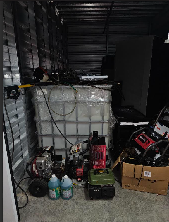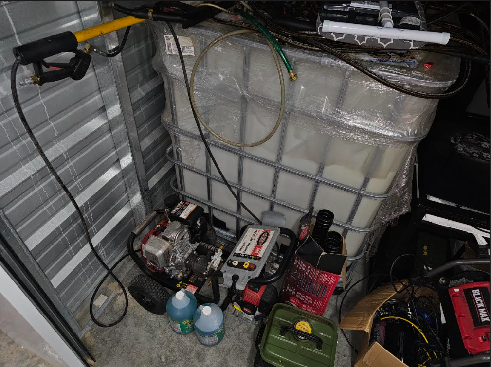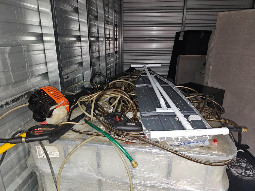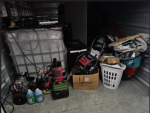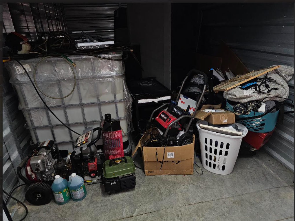 This unit appears to contain…IBC TANK, HOSES, POWER TOOLS, SOLUTION, PRESSURE WASHERS, PORTABLE GENERATOR, BABY GATE, TOOL BOX WITH POSSIBLE TOOLS INSIDE, WALL ART, VACUUM, IRONING BOARD, FURNITURE, CLOTHES HAMPERS, MISCELLANEOUS AND PERSONAL ITEMS