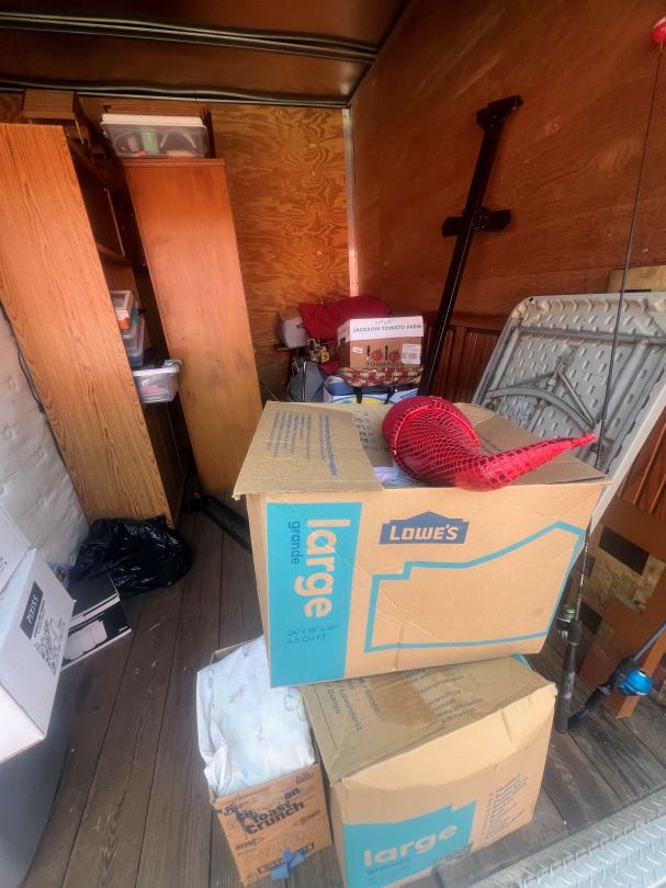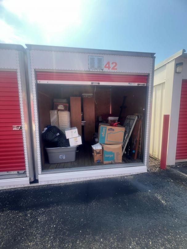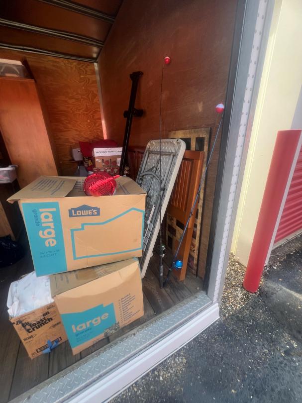 This unit appears to contain…Mattresses, fishing items, a small folding table, wooden shelving, a Metal bed frame, and other miscellaneous items.