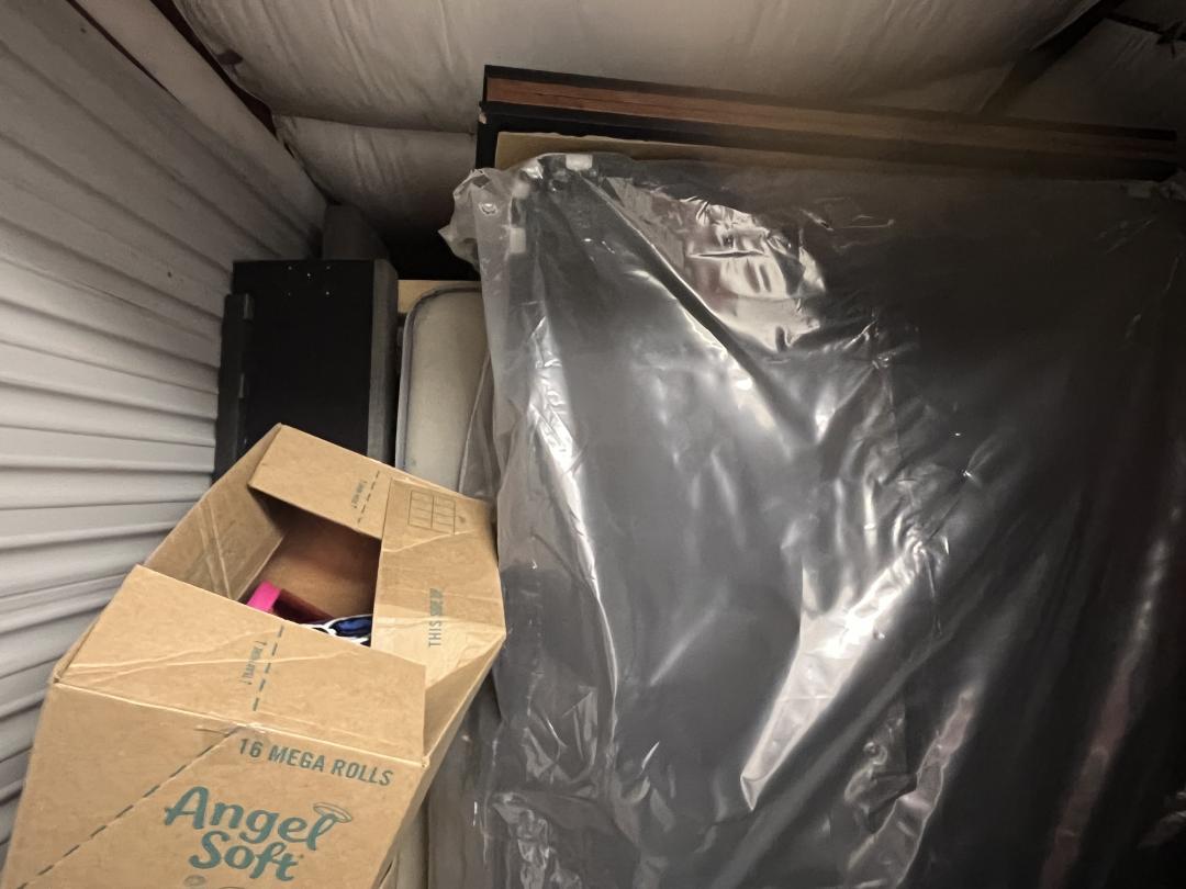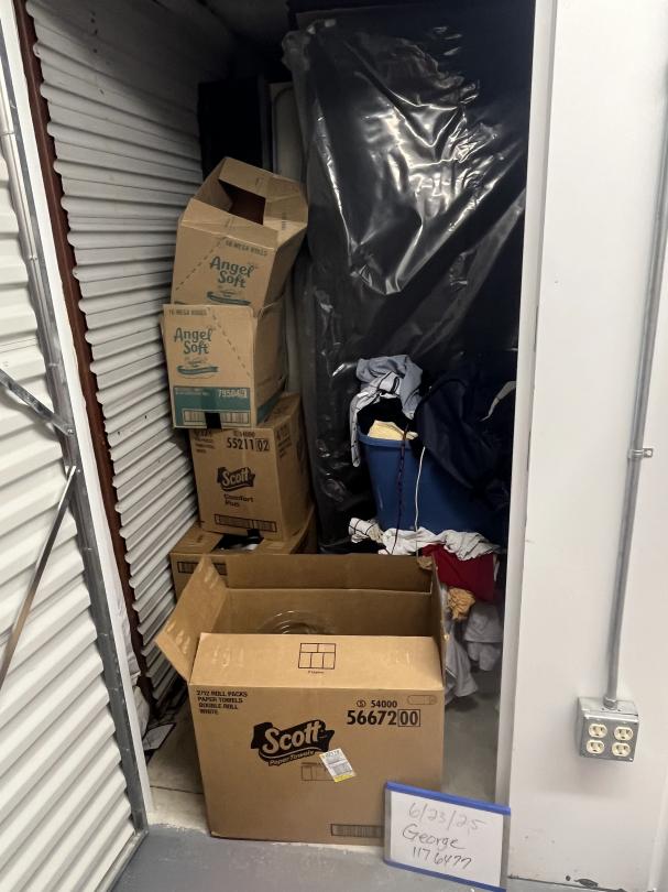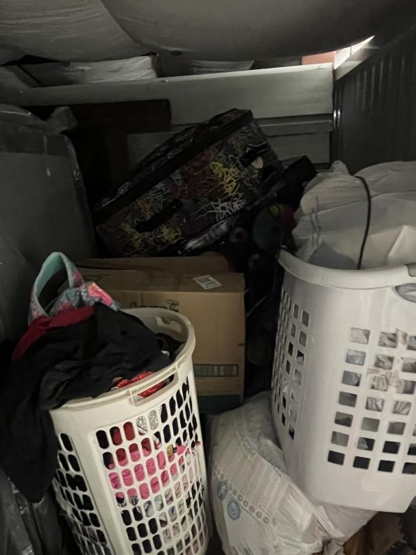 This unit appears to contain…Boxes, Buckets, Kitchen Misc, Bed, Propane Tank, Baskets, Clothes, Suitcase