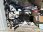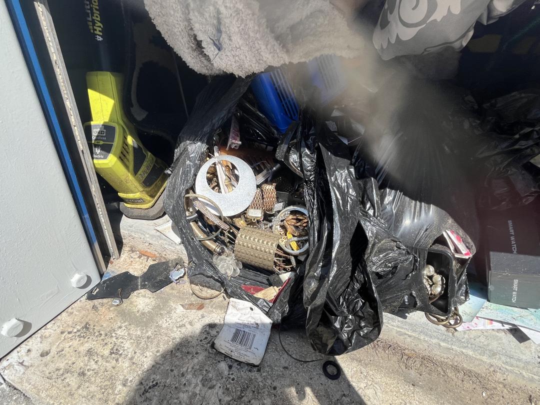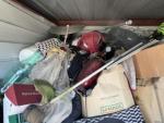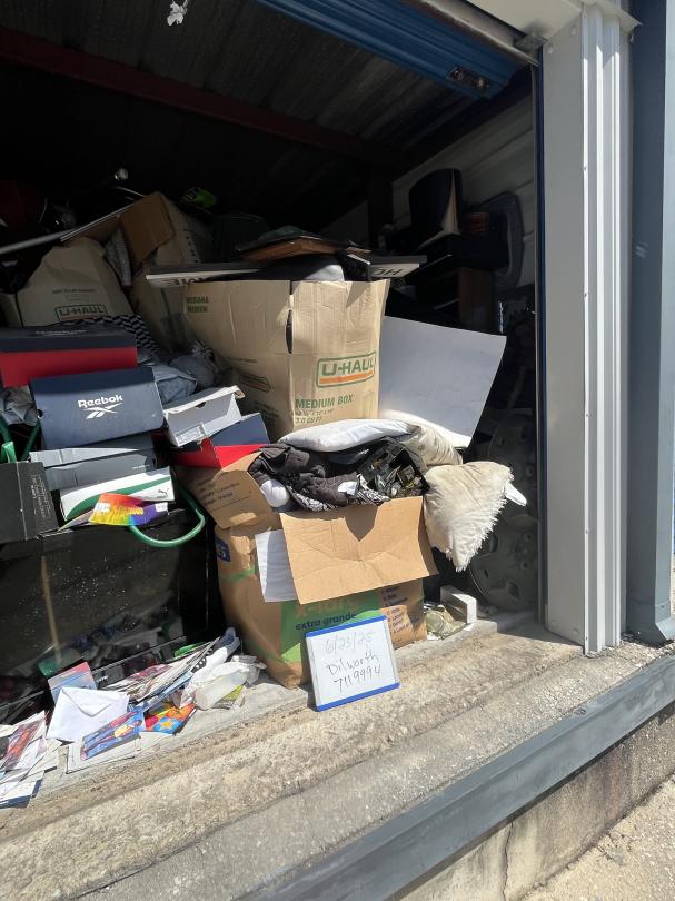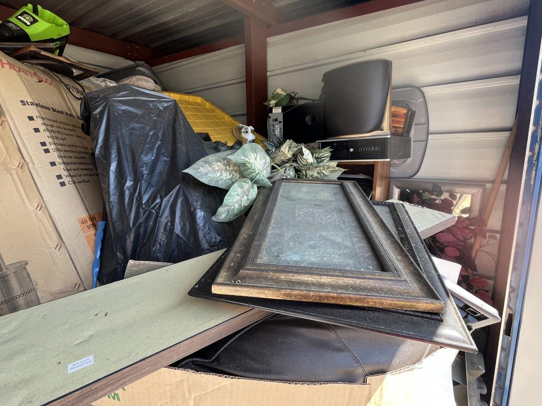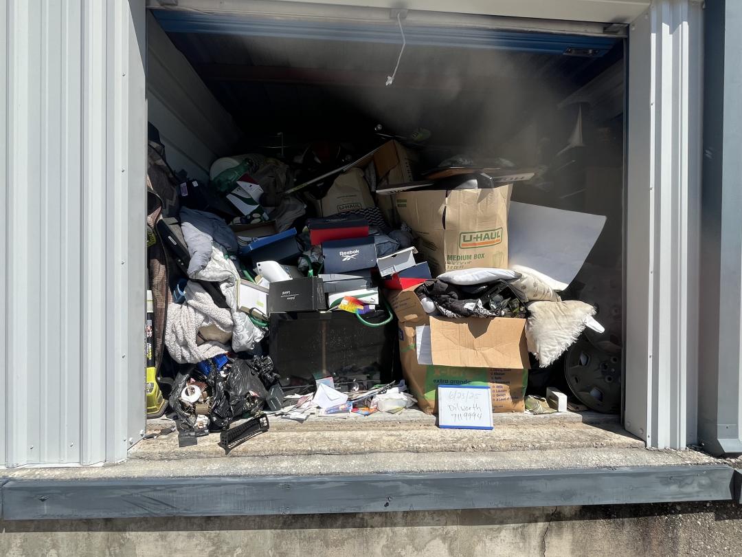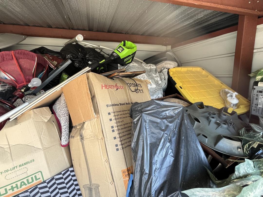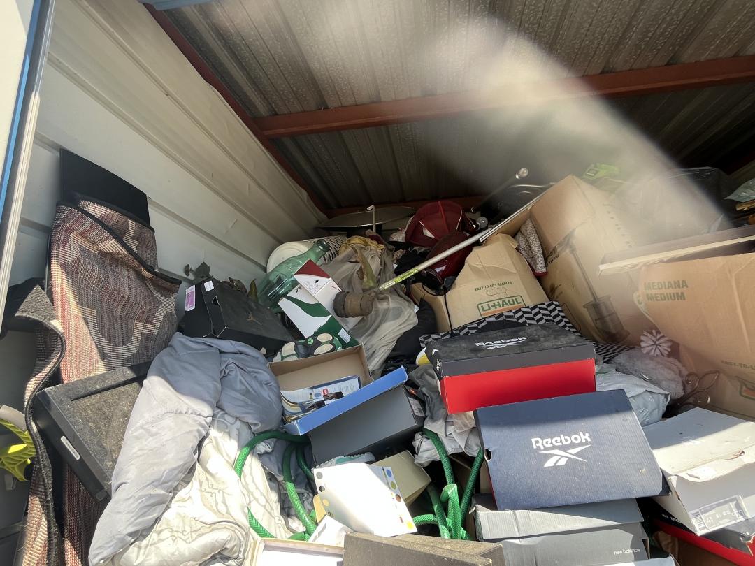 This unit appears to contain…Jewelry, hubcaps, boxes, weedeater, TV, shoe boxes, baskets, clothes, pictures