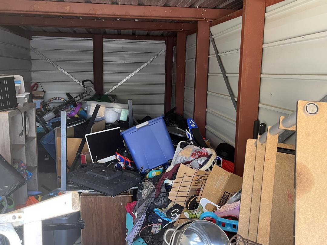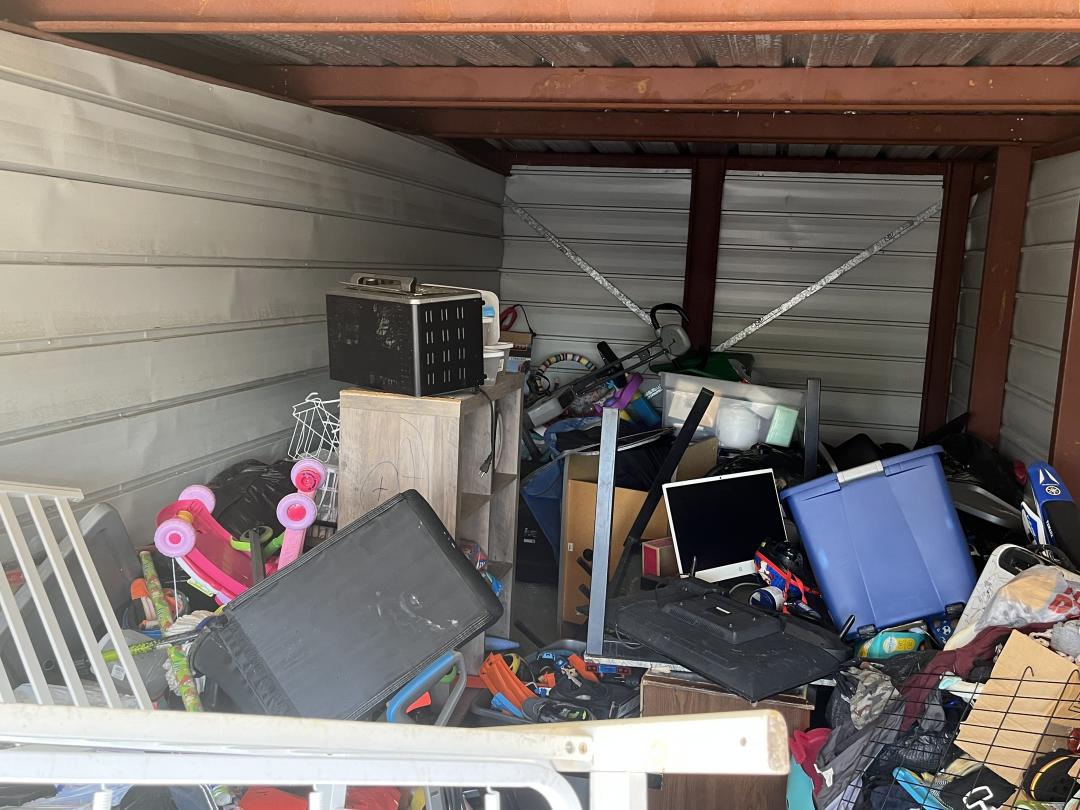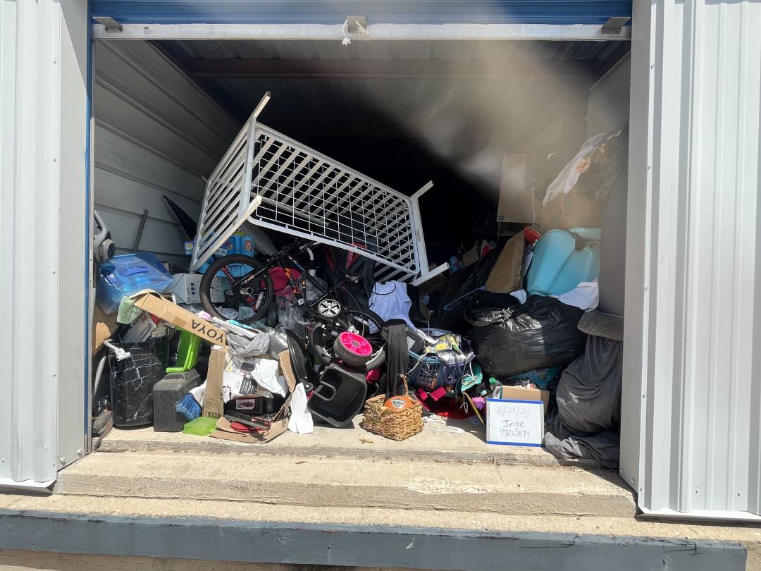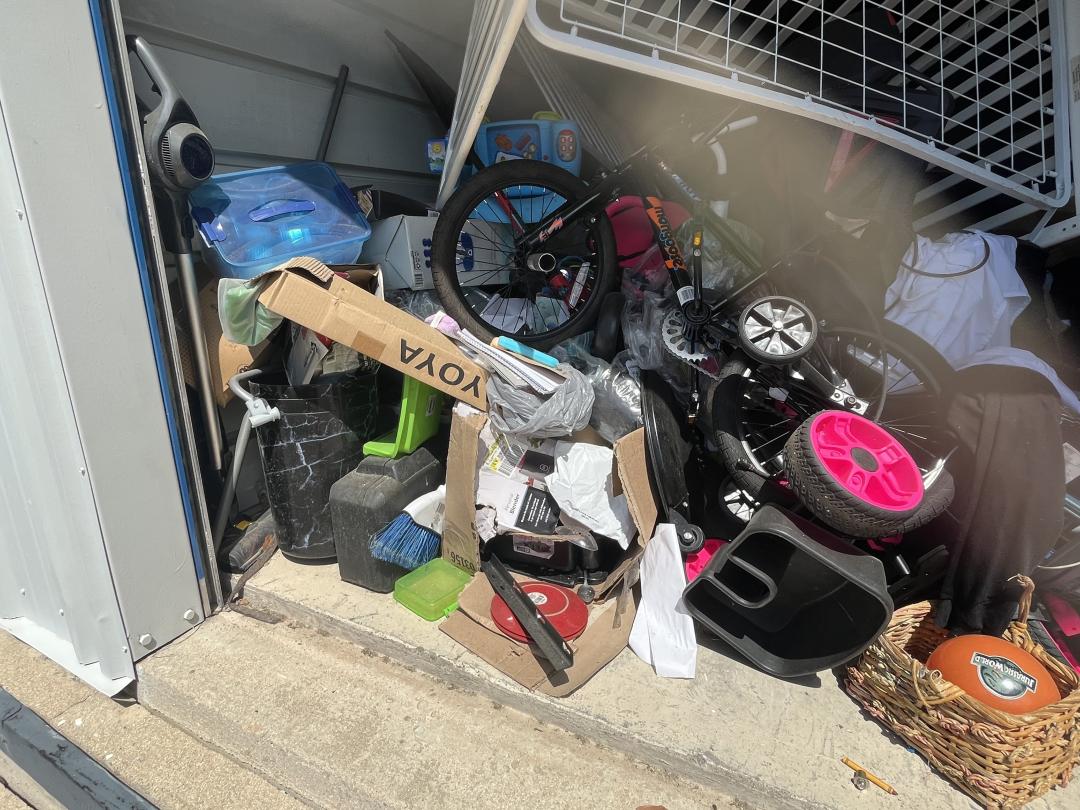 This unit appears to contain…Bags, Shelf, Crib, Bike, TV, Buckets, Kitchen misc, Toys