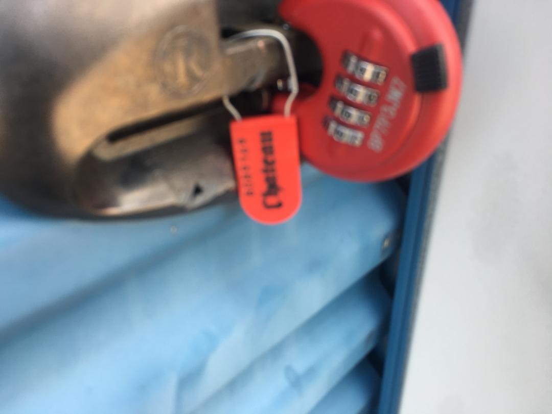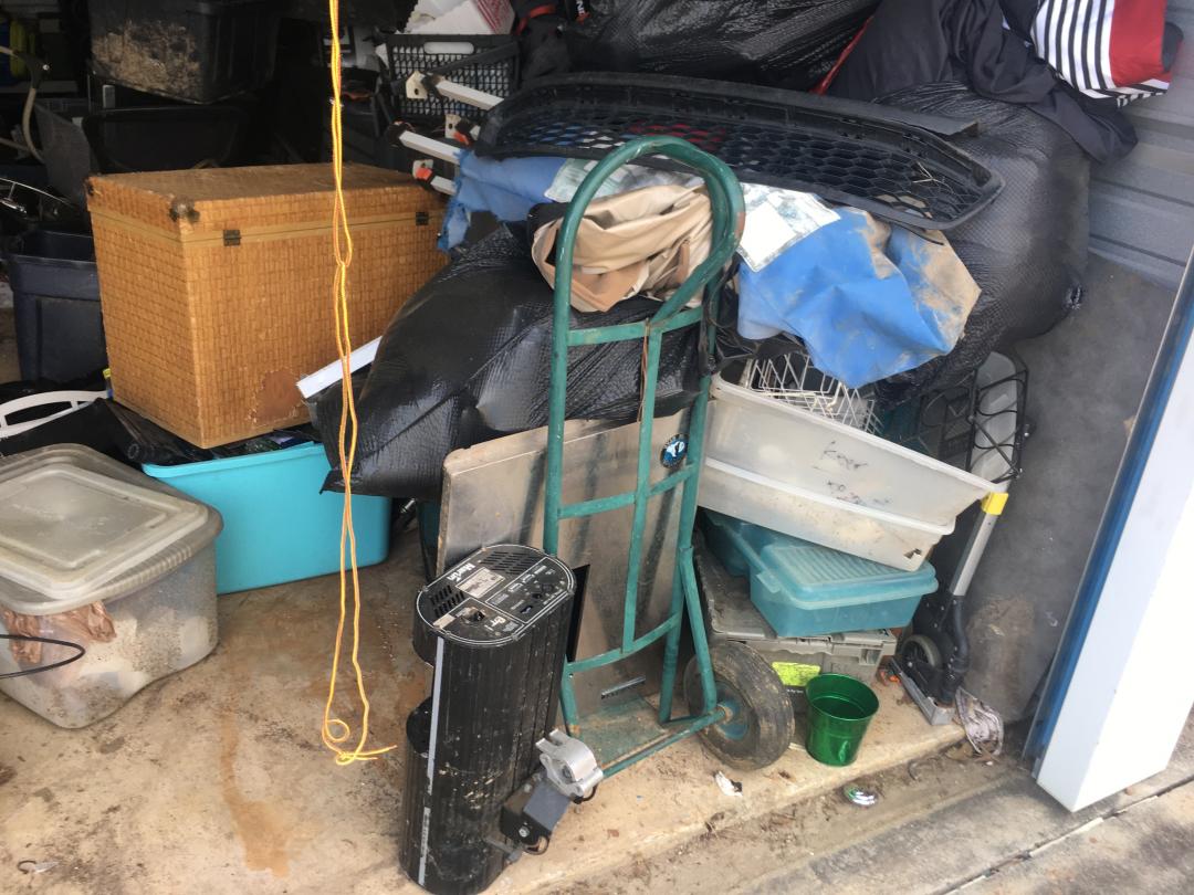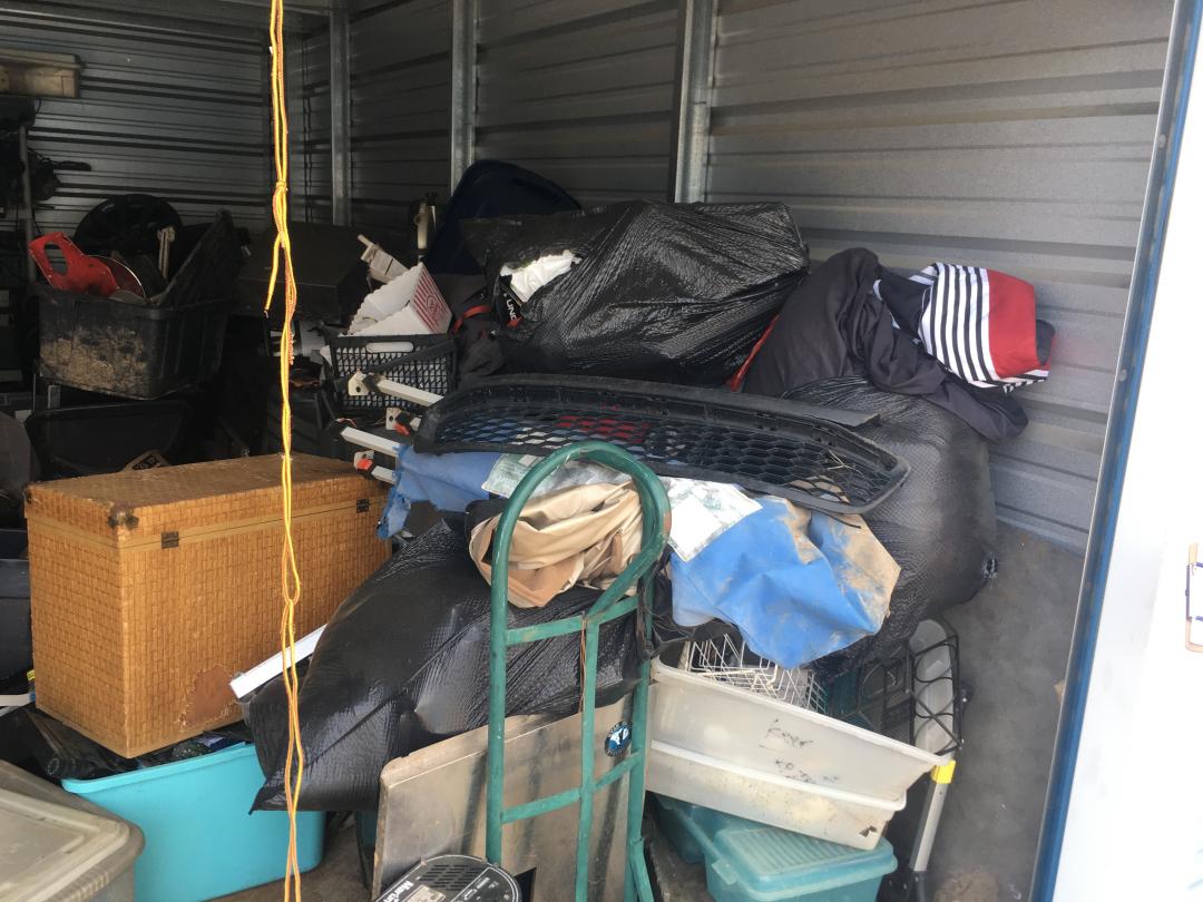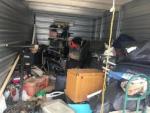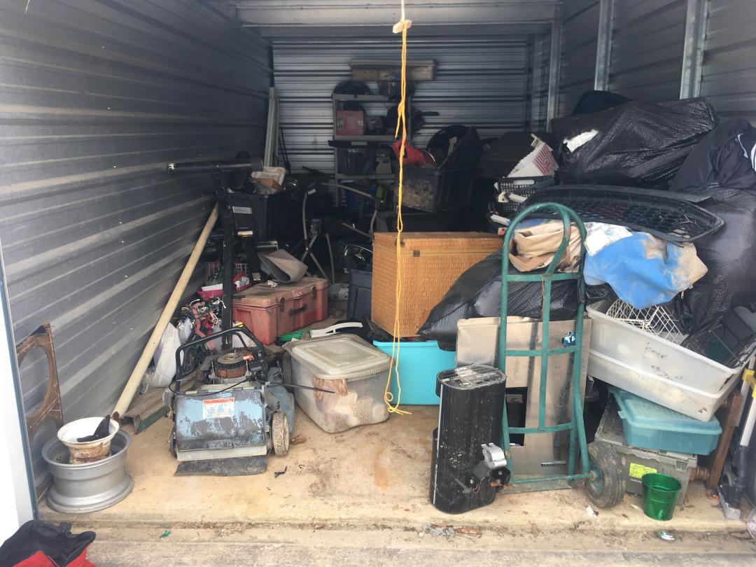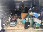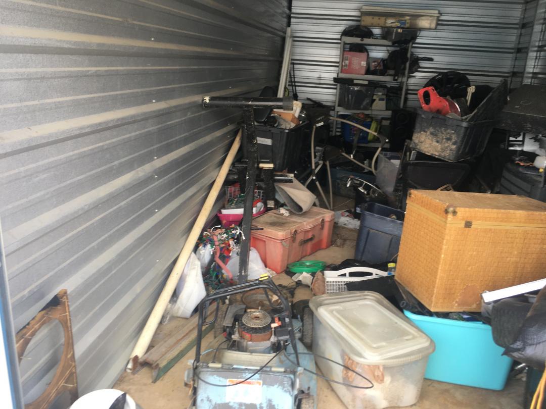 This unit appears to contain…push mower, dolly, weight bench, 2 ac units, shelving unit, tool boxes, computer chair, band saw, razor scooter, car stereos, sub woofers, black rims, mud tires, bags, boxes, misc. tools, vacuums.