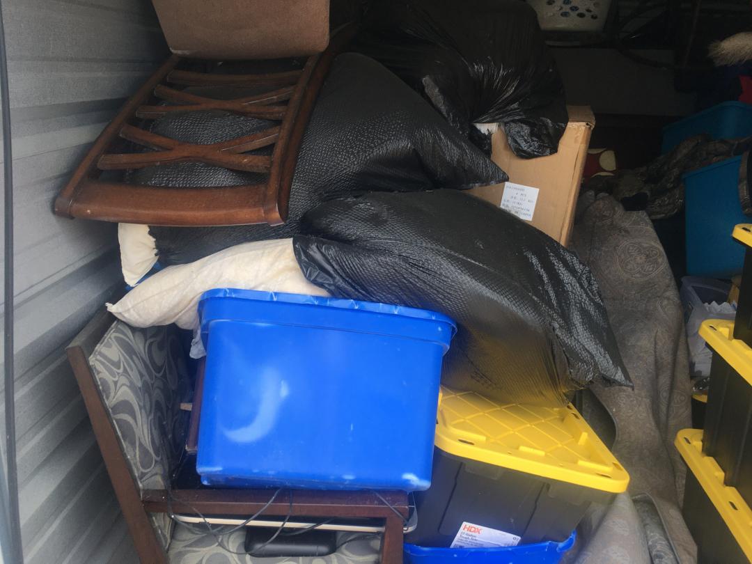 This unit appears to contain…blue velvet love seat, full bed, queen bed and box spring, wicker cocktail table, cooler, area rug, stove, storage roller bins, totes.