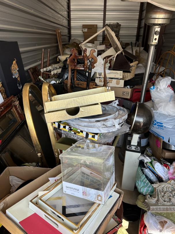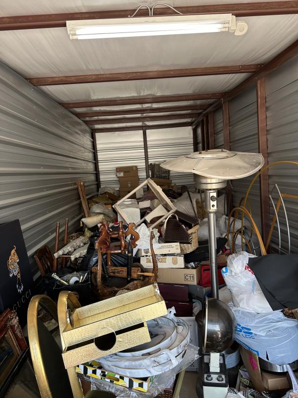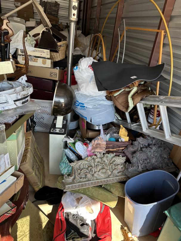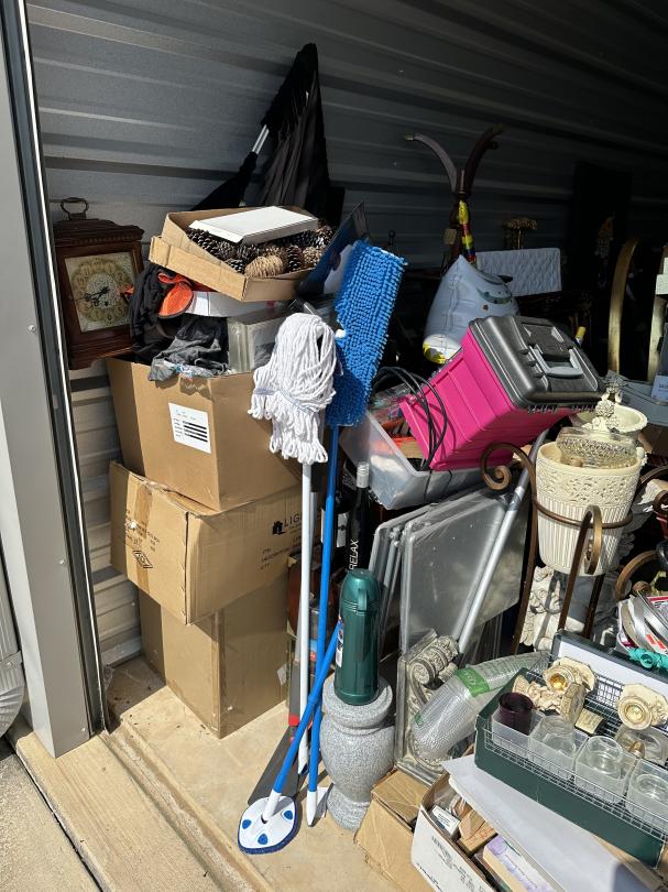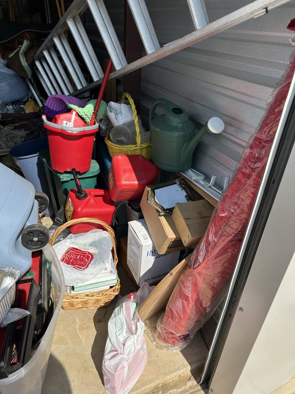 This unit appears to contain…outside access, boxes, totes, ladder, home decor, garbage can, clock, cleaning supplies, outdoor heater, furniture