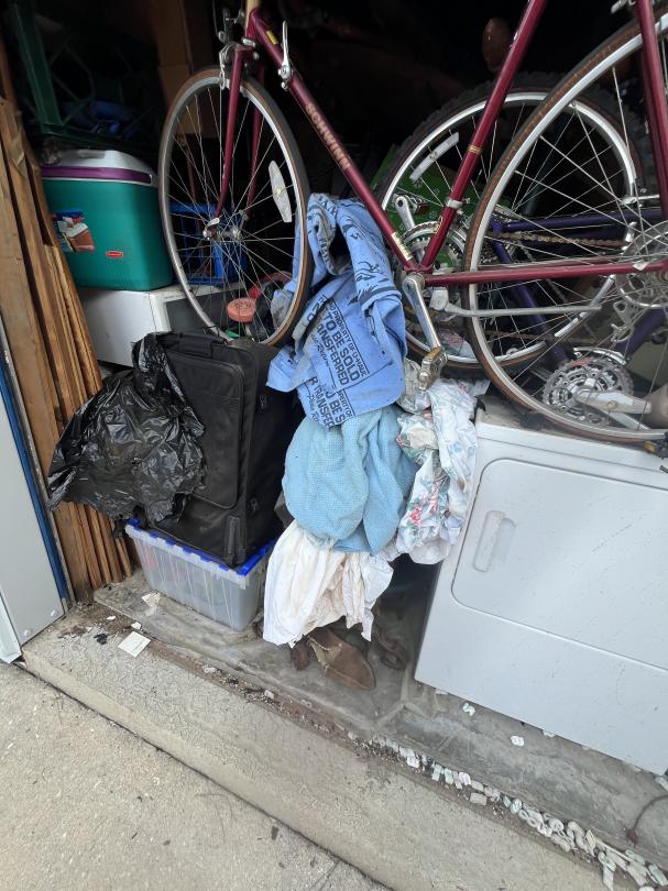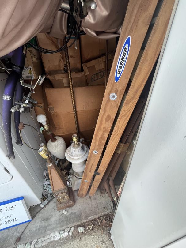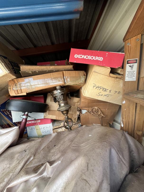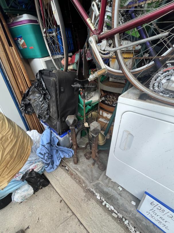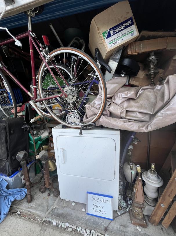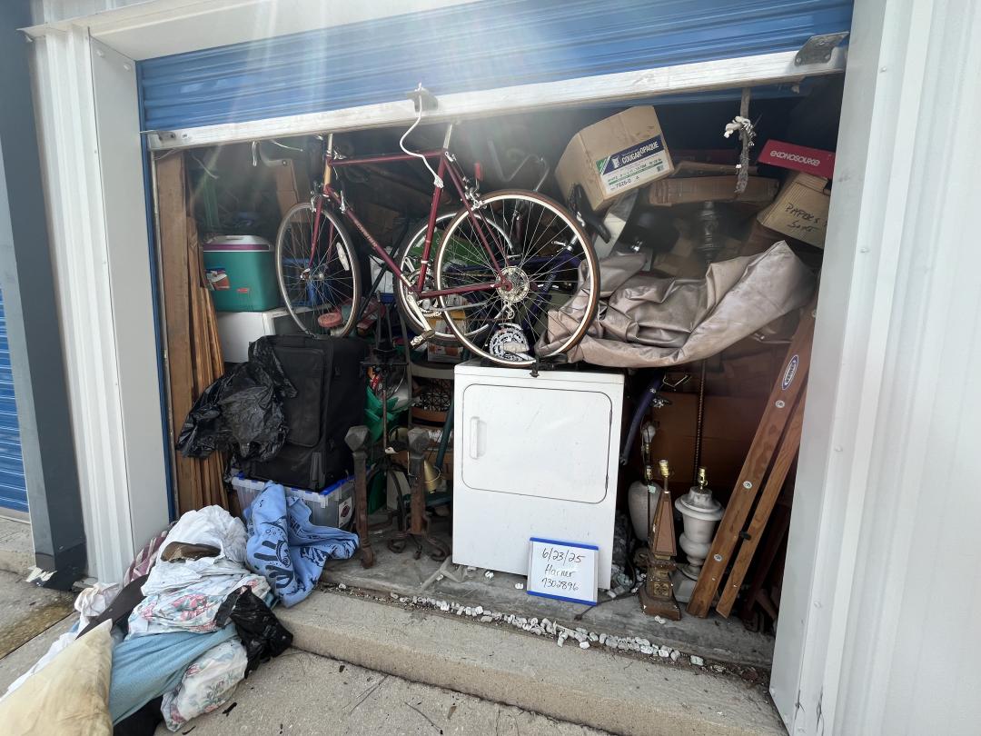 This unit appears to contain…Dryer, Lamps, Bikes, Boxes, Antiques, Cooler, Buckets, Suitcase, Microwave