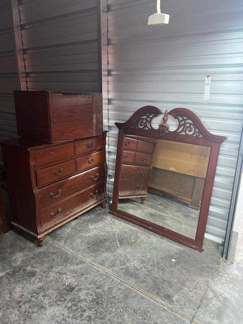 This unit appears to contain…Dresser, Bedframe, End Tables, Headboard, Table, Mirror