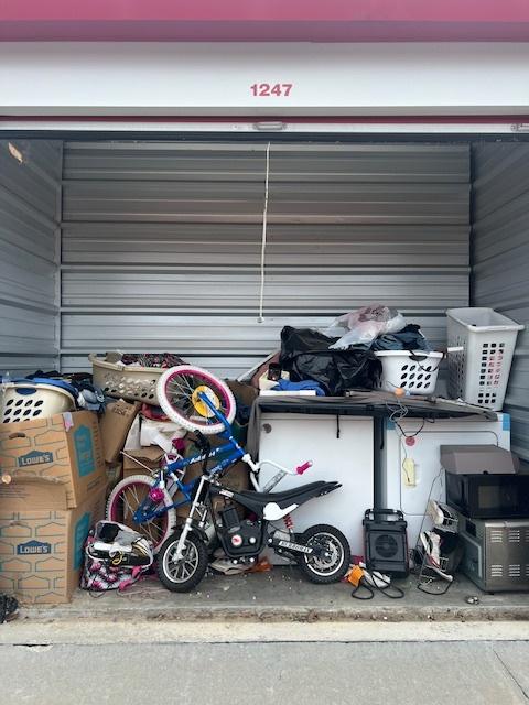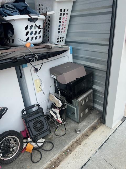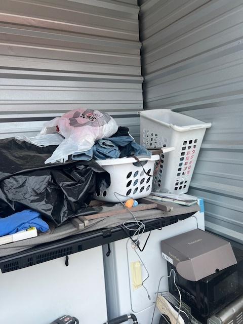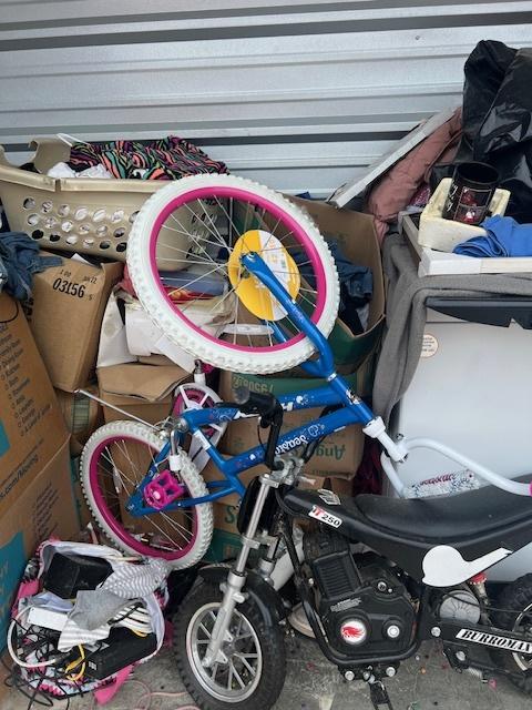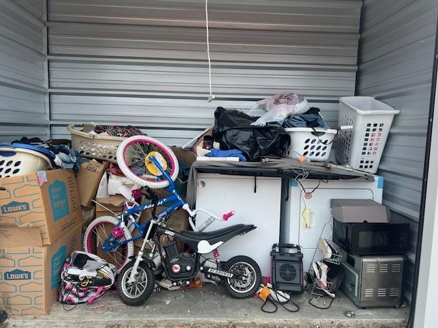 This unit appears to contain…Washer, Dryer, TV, Bikes, Boxes, Microwave, Totes