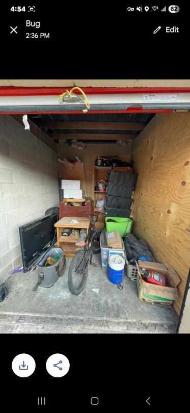 This unit appears to contain…TOTES, BOXES, TV, BICYCLE, END TABLE, BAG, BOOKCASE, WATER COOLER, LAUNDRY BASKET, GAS CAN