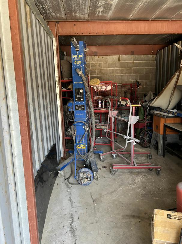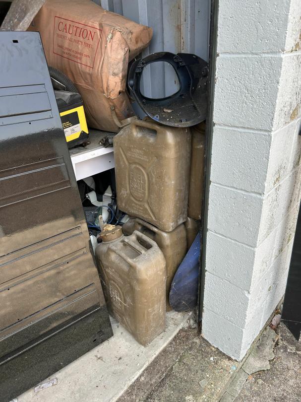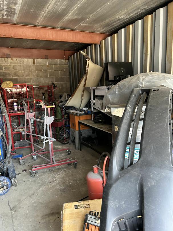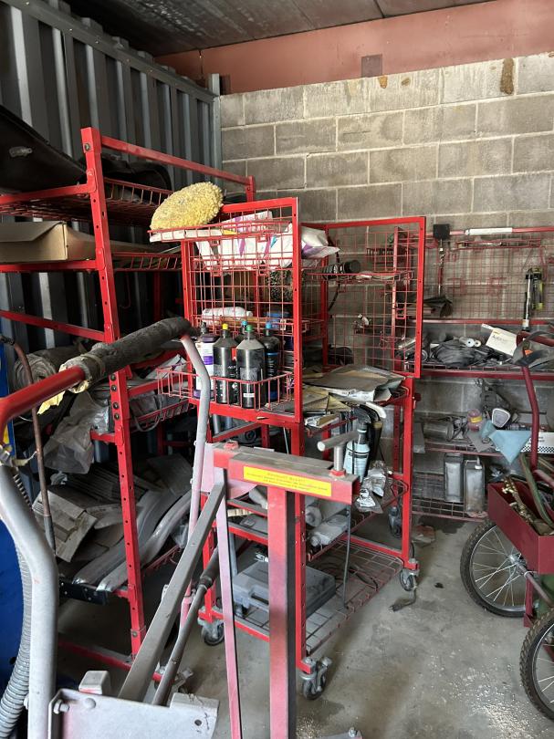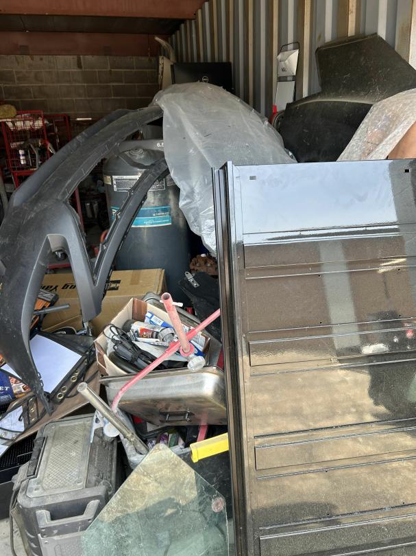 This unit appears to contain…Auction Tag #7623870. Items in unit: gas cans, shop equipment, racks, parts, misc. tools