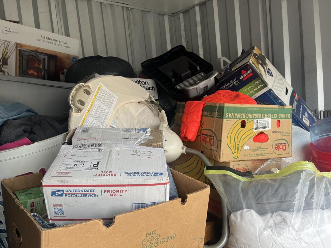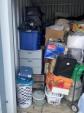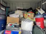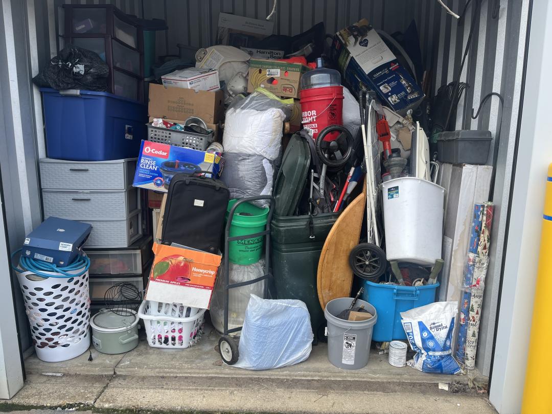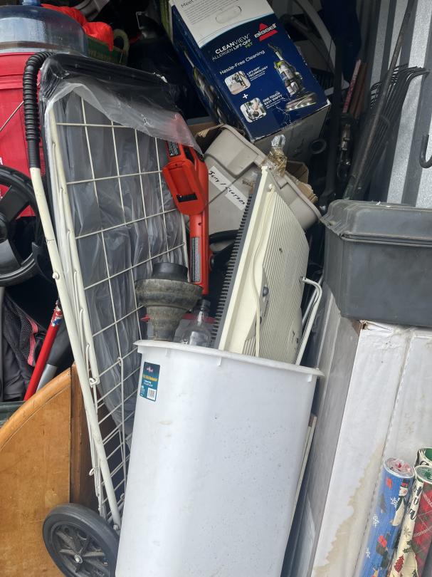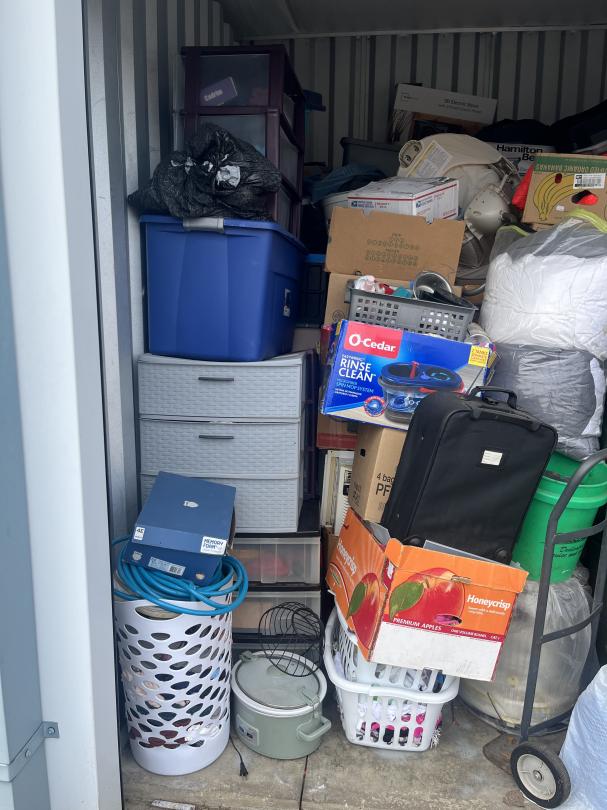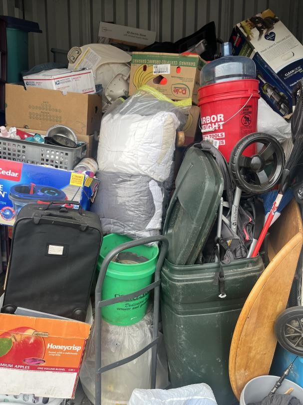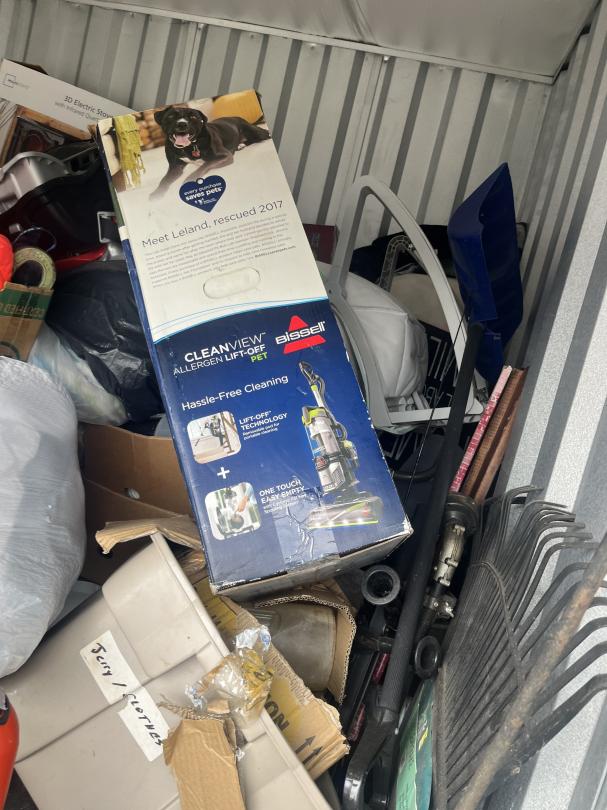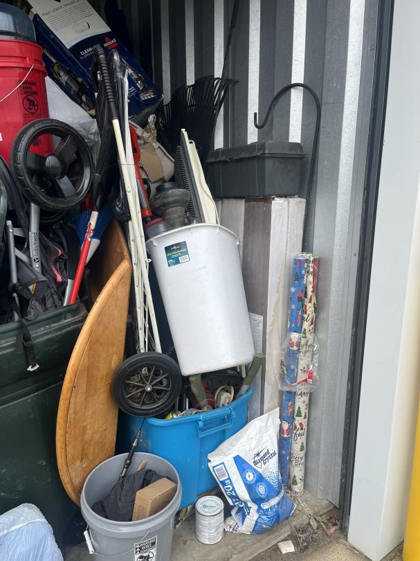 This unit appears to contain…bags, baskets, boxes, table, totes, buckets, tool box, window fan, garbage can, suitcase, hand dolly, LVP flooring, 3 drawer plastic storage carts, stroller, baby swing, rake, shovel, brooms, wrapping paper, shepherds hooks, portable foldable shopping cart, alot of misc items
