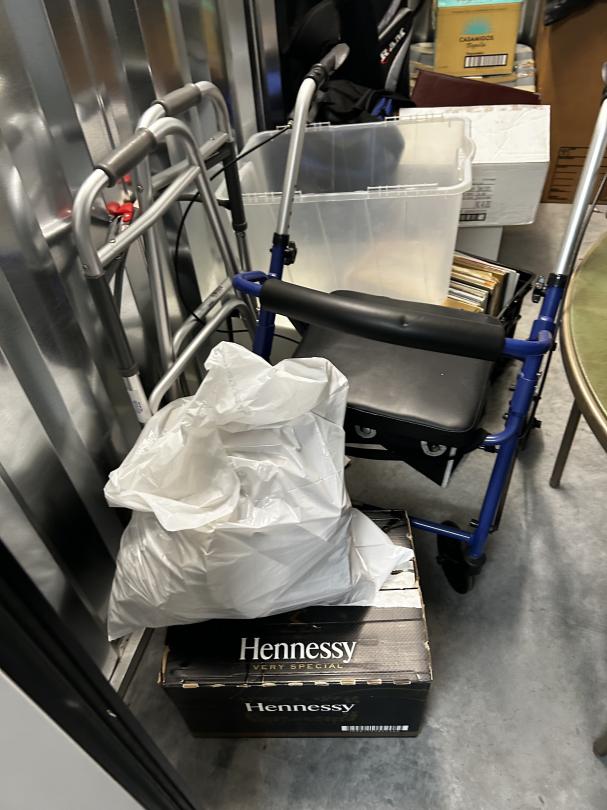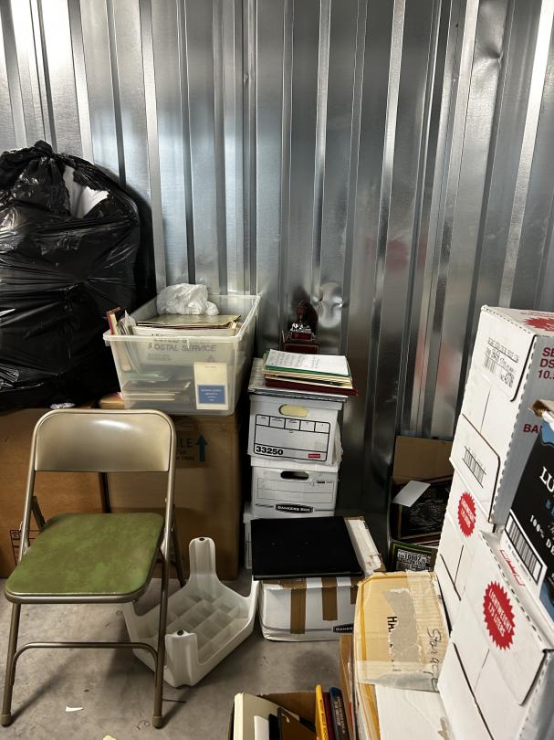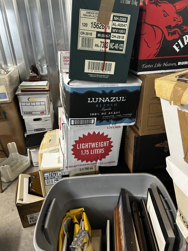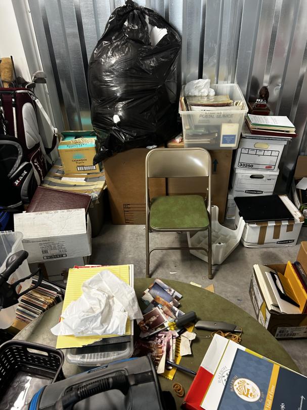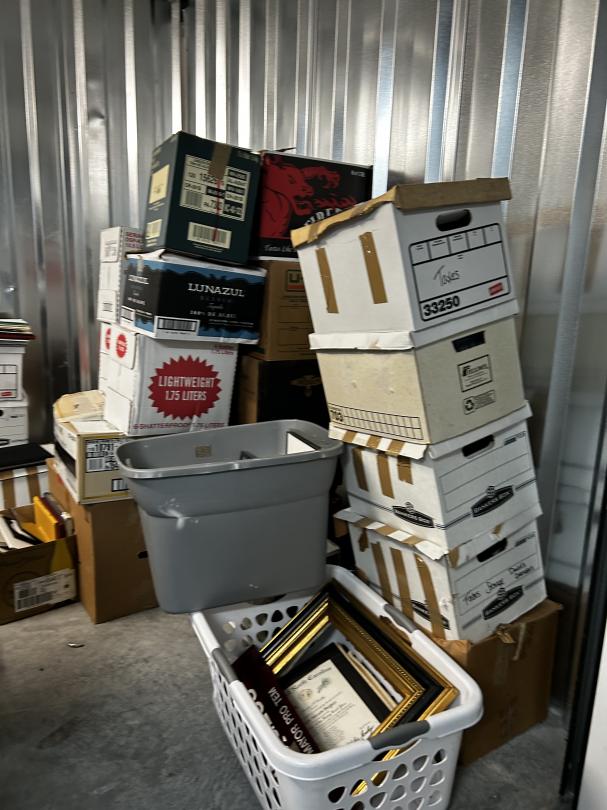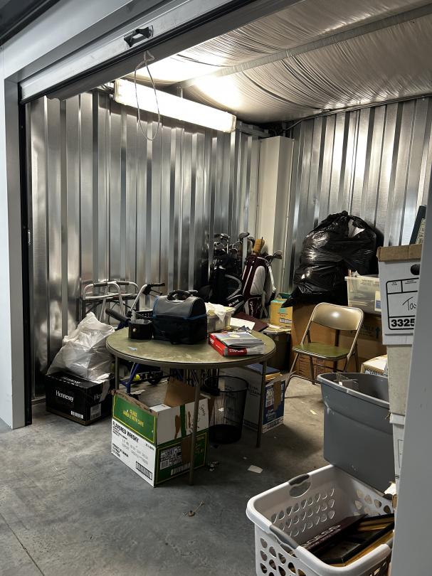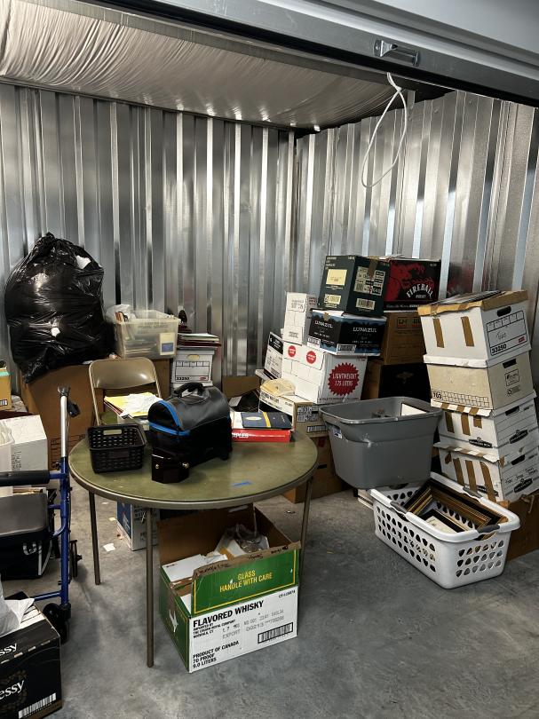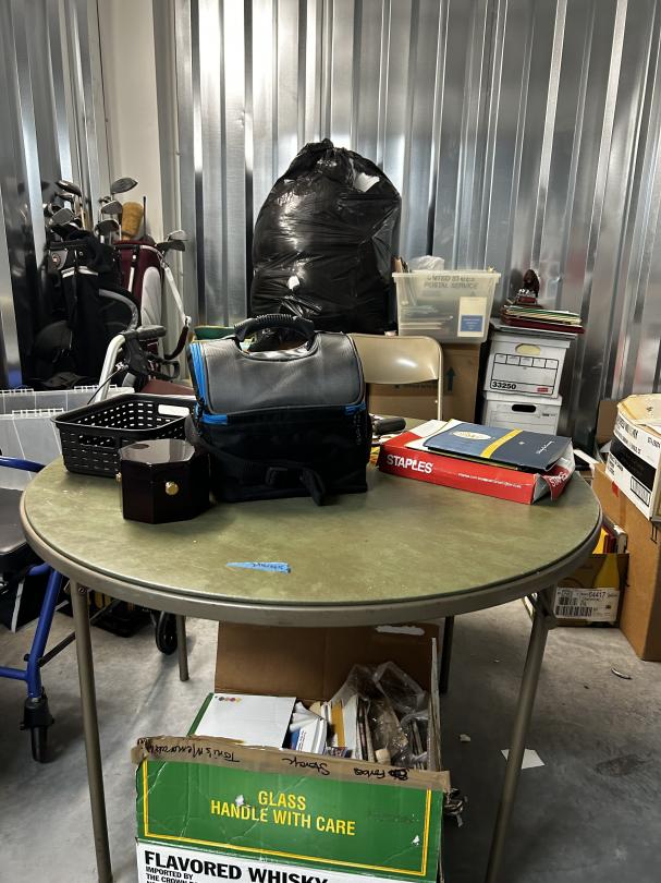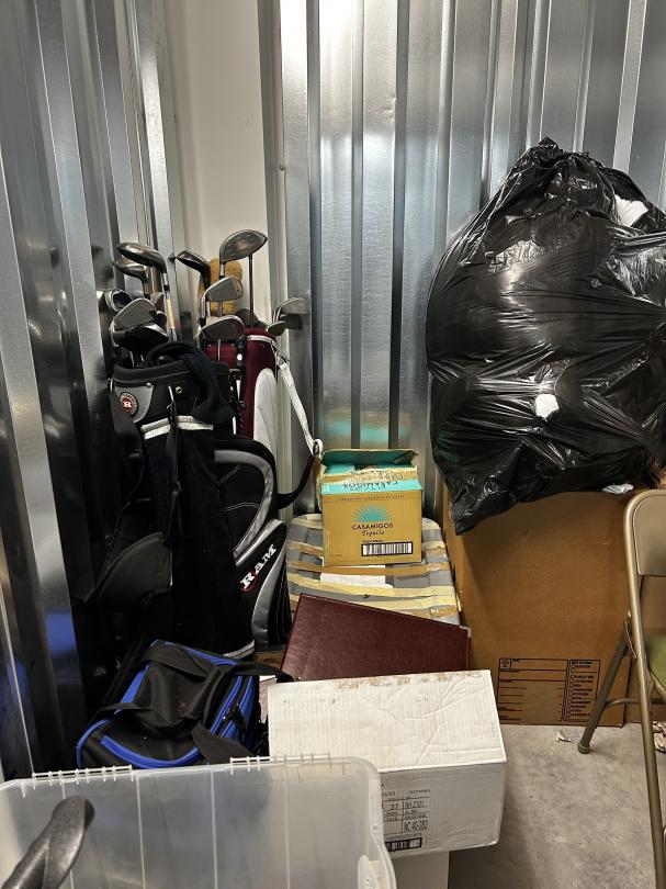 This unit appears to contain…Personal Property, Guitar case, Adult Walkers, End Table, Lunch Totes, Taylor Golf Club Set, Ram Golf Club Set, Table, Stool, Chair, Hamper, Pictures, Wall Arts, Plastic Bins, Boxes, Books, Plastic Bags.