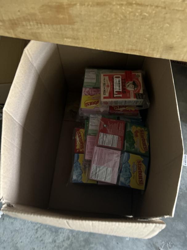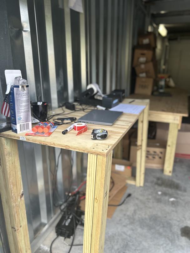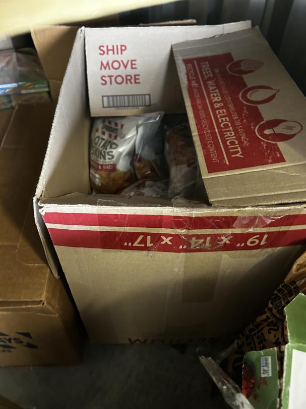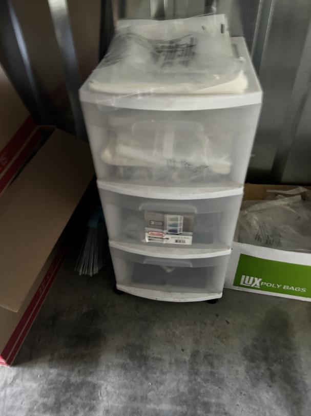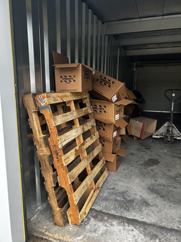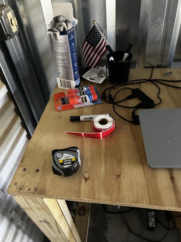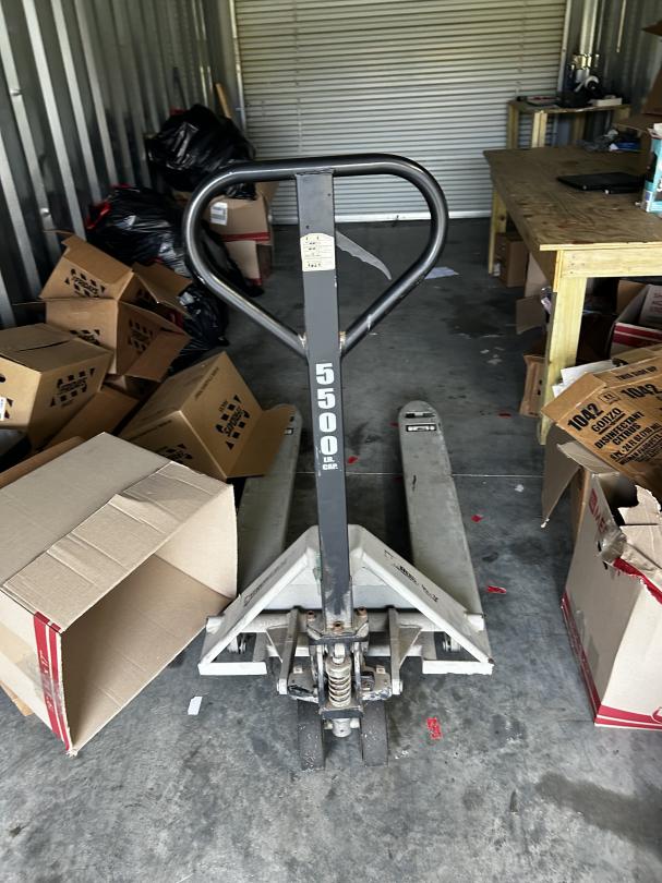 This unit appears to contain…Business Goods, Pallet Jack, Boxes, Wooden tables, Laptop, Power Cordes, Candies, Chairs, Fan, Plastic Storage Drawer, Markers, Pens, Measuring Tape, Plastic Bags, Wooden Pallets, Gloves, Trash Bags, Label Machine, Scale.