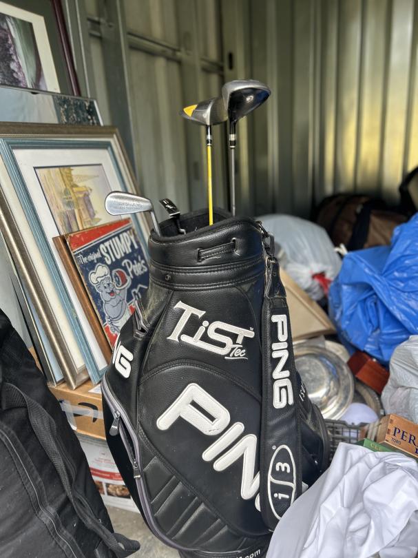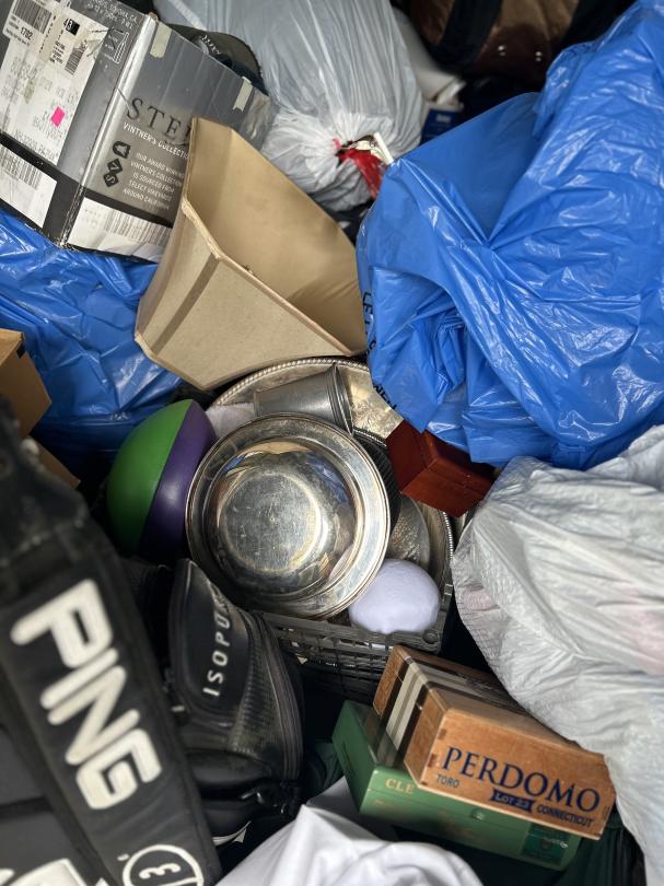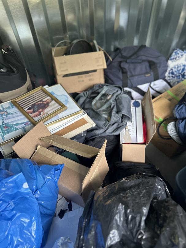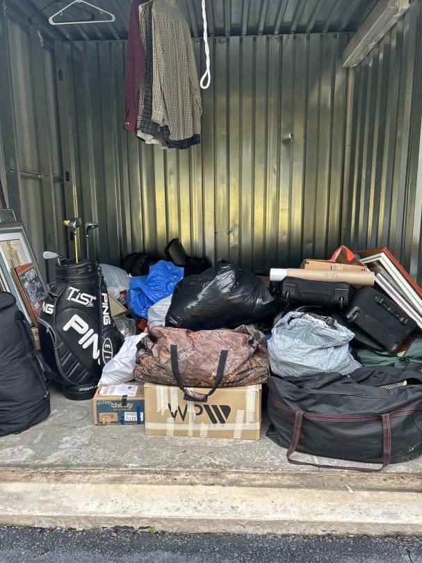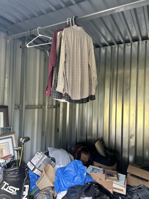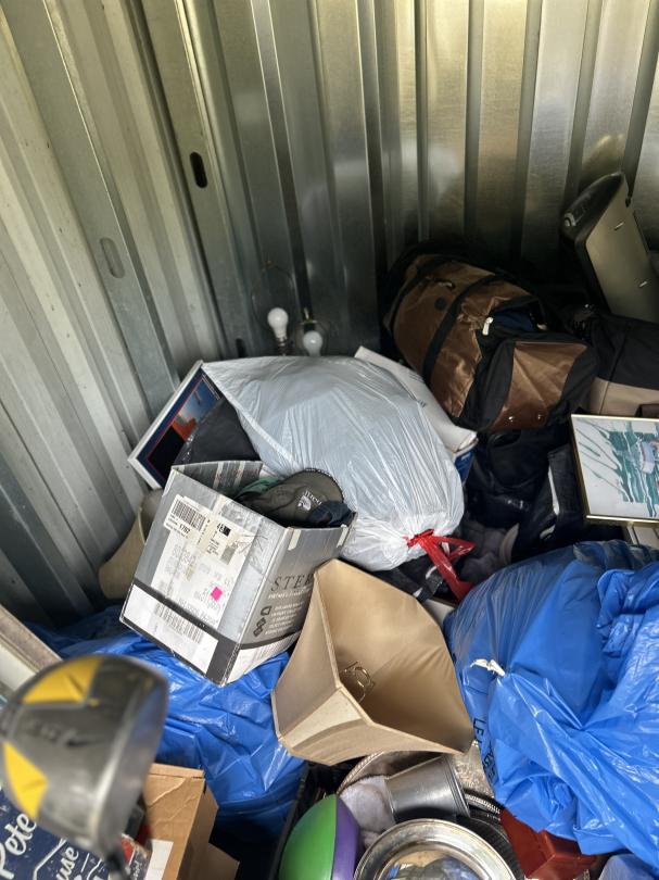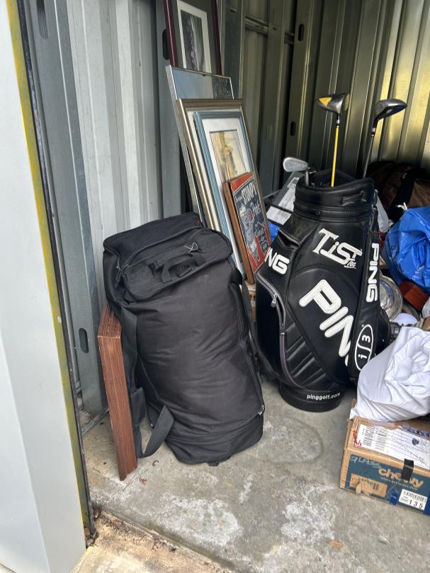This unit appears to contain…Personal Property, Golf club, Lamps, Silverware, Wall Arts, Boxes, Plastic Bags, Travel bags, Clothing, Books, Tennis Rackets, Suitcase, Hangers, Fan.