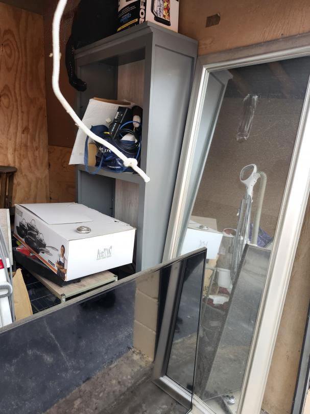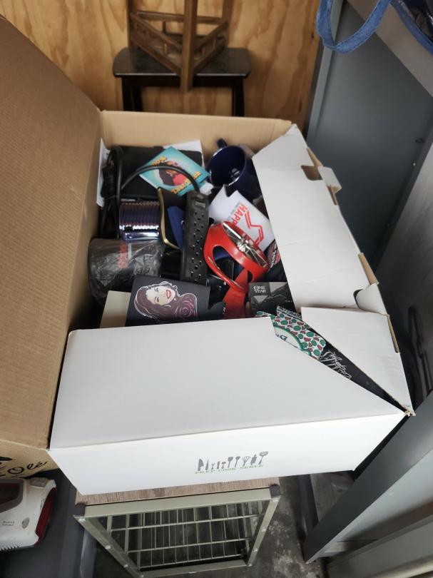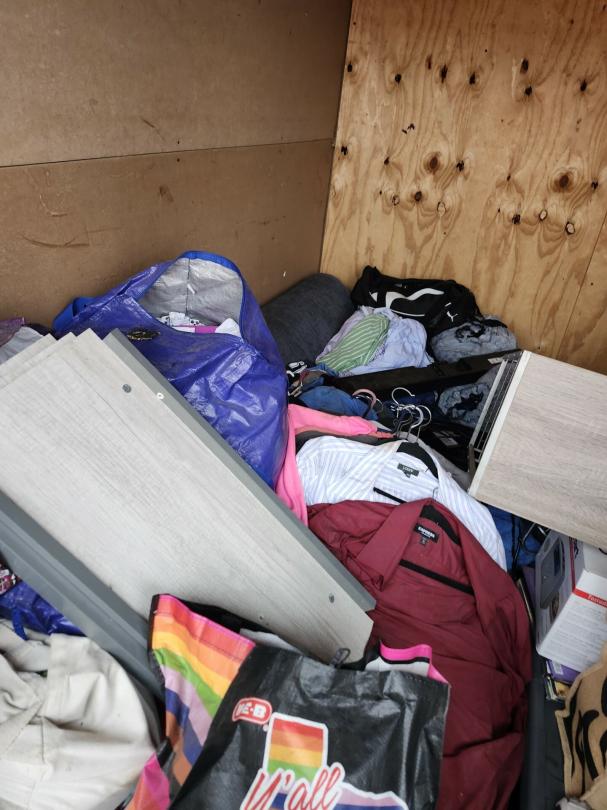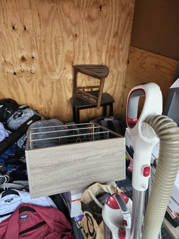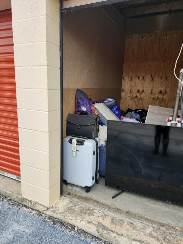 This unit appears to contain…SHELVES, MIRROR, TV, VACUUM, CLOTHES, VACUUM, BOXES, TOTES, END TABLE, LUGGAGE