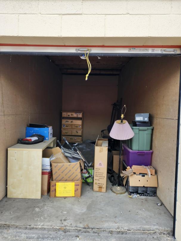 This unit appears to contain…DRESSER, BOXES, DESK, LAMPS, TOTES, PULL-UP BAR