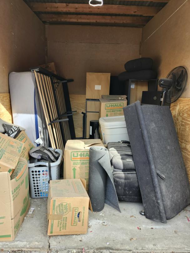 This unit appears to contain…BED, MATTRESS, BOXES, FANS, LAUNDRY BASKET, BAGS, TOTES, FAN, LUGGAGE, FURNITURE