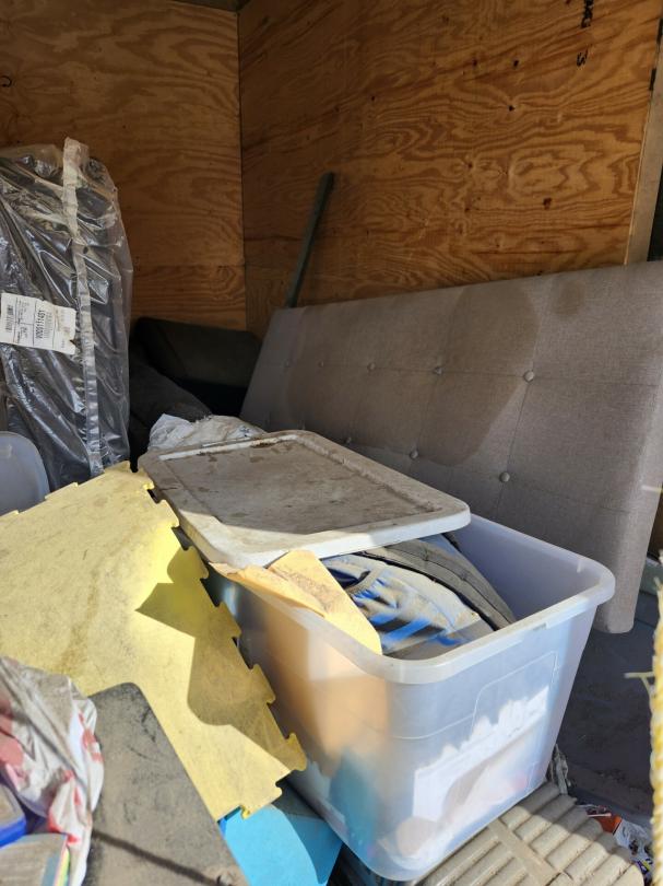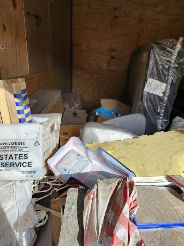 This unit appears to contain…TOTES, HEADBOARD, BOXES, STORAGE DRAWERS, WOODEN CRATES