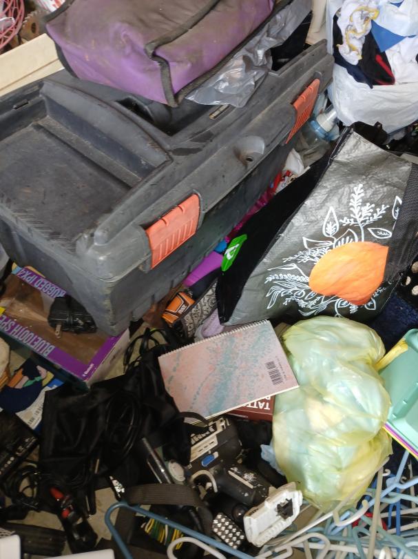 This unit appears to contain…Clothes, tools, cords, cell phones, purses, boxes, bags, dishes, shelves, watches, belts, blankets,suitcase,notebooks, paint,bike parts,baskets,battery charger