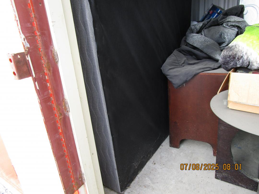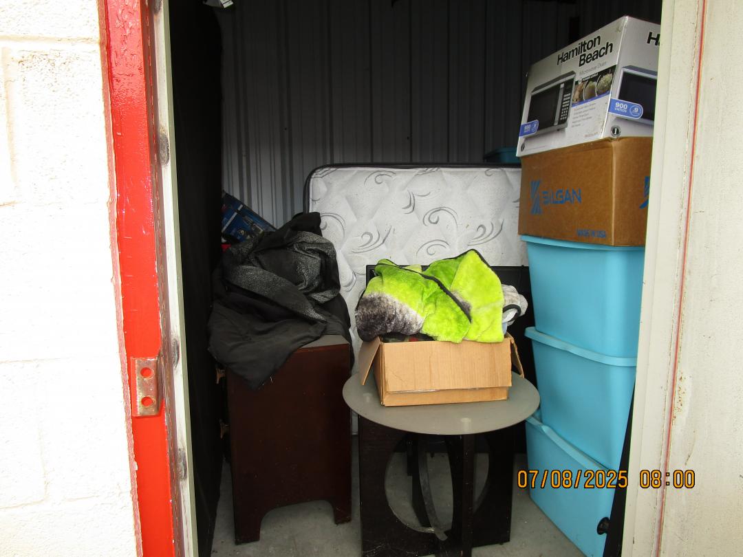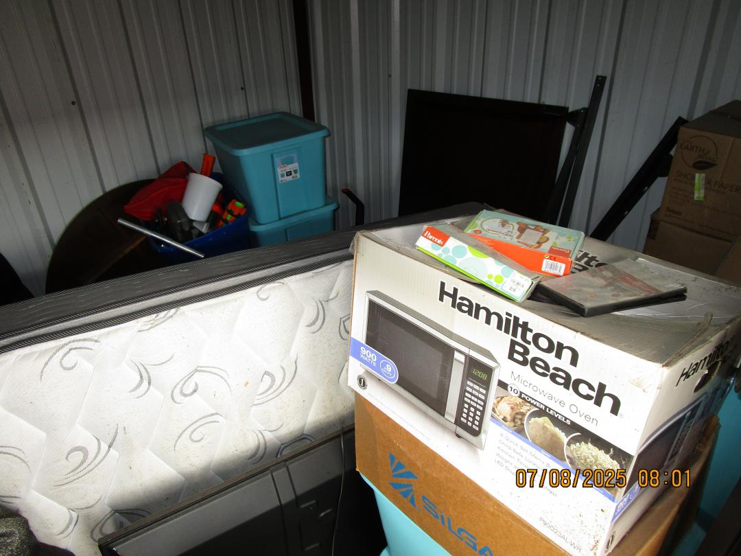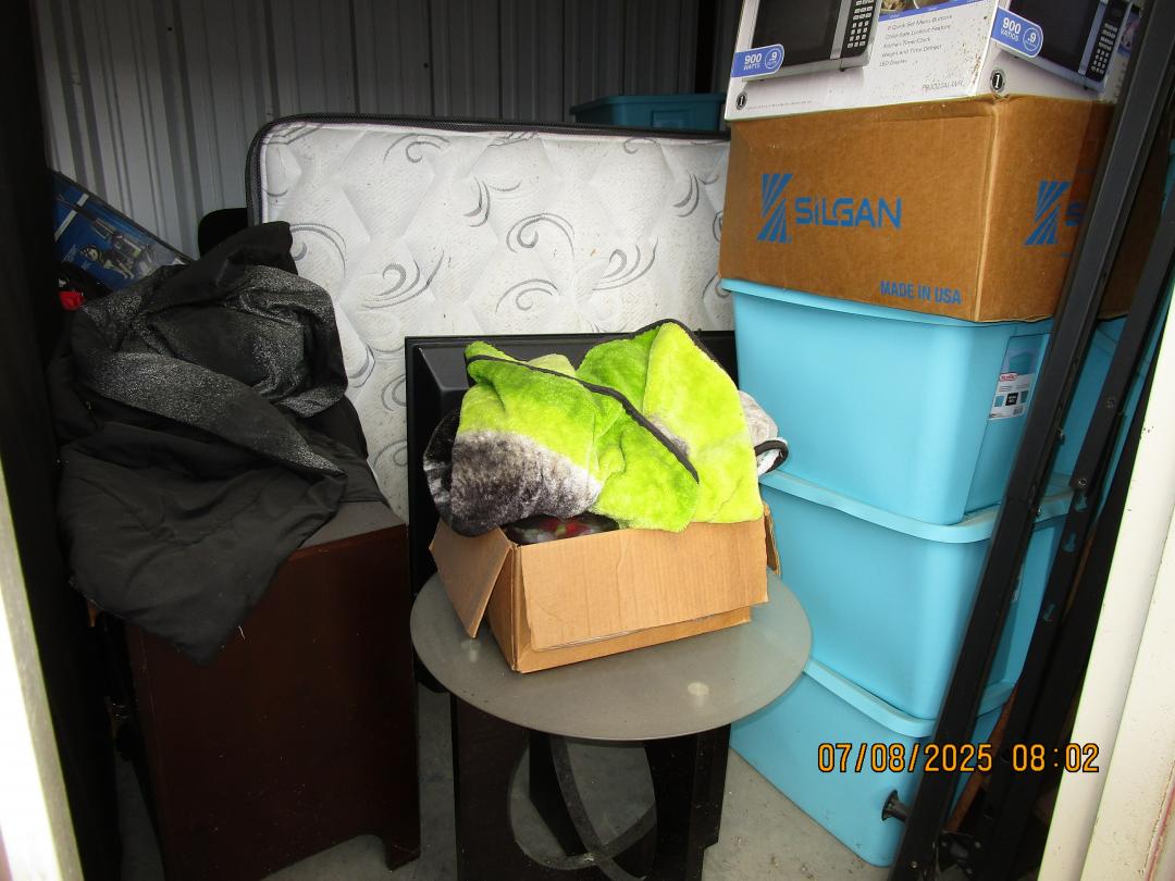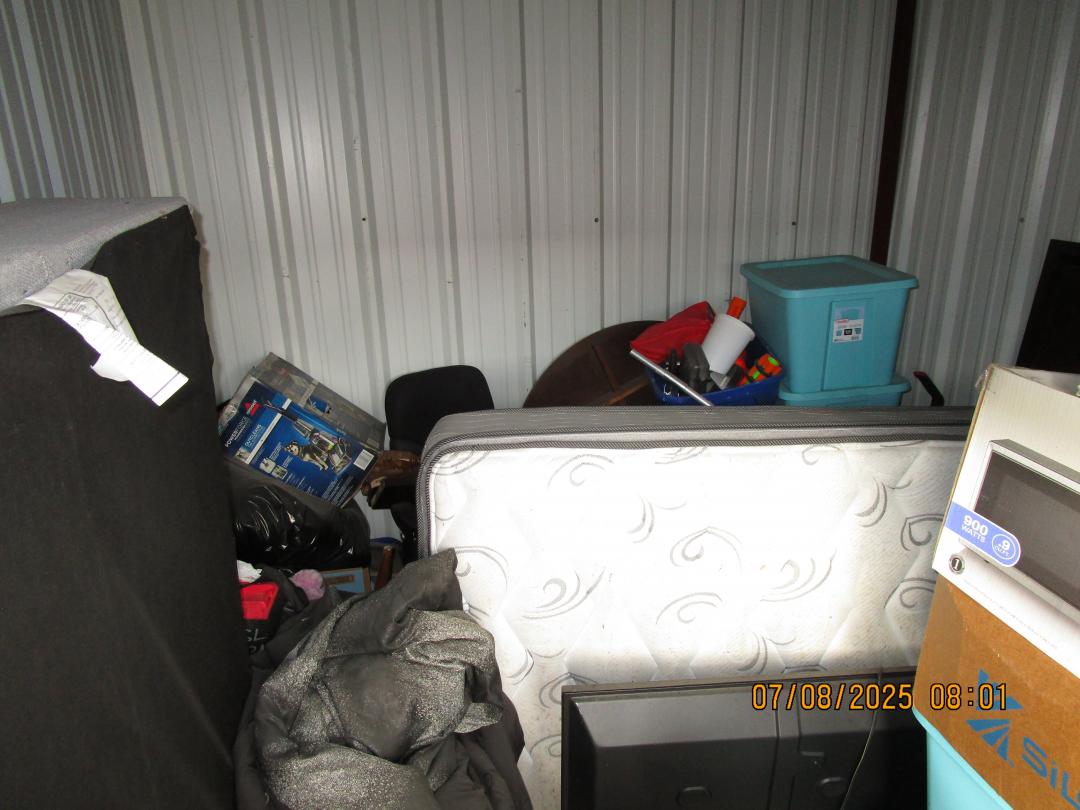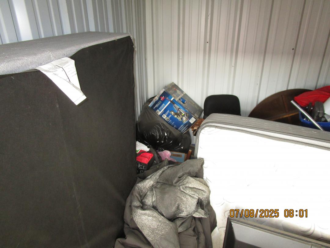 This unit appears to contain…boxes, totes, mattresses, tv