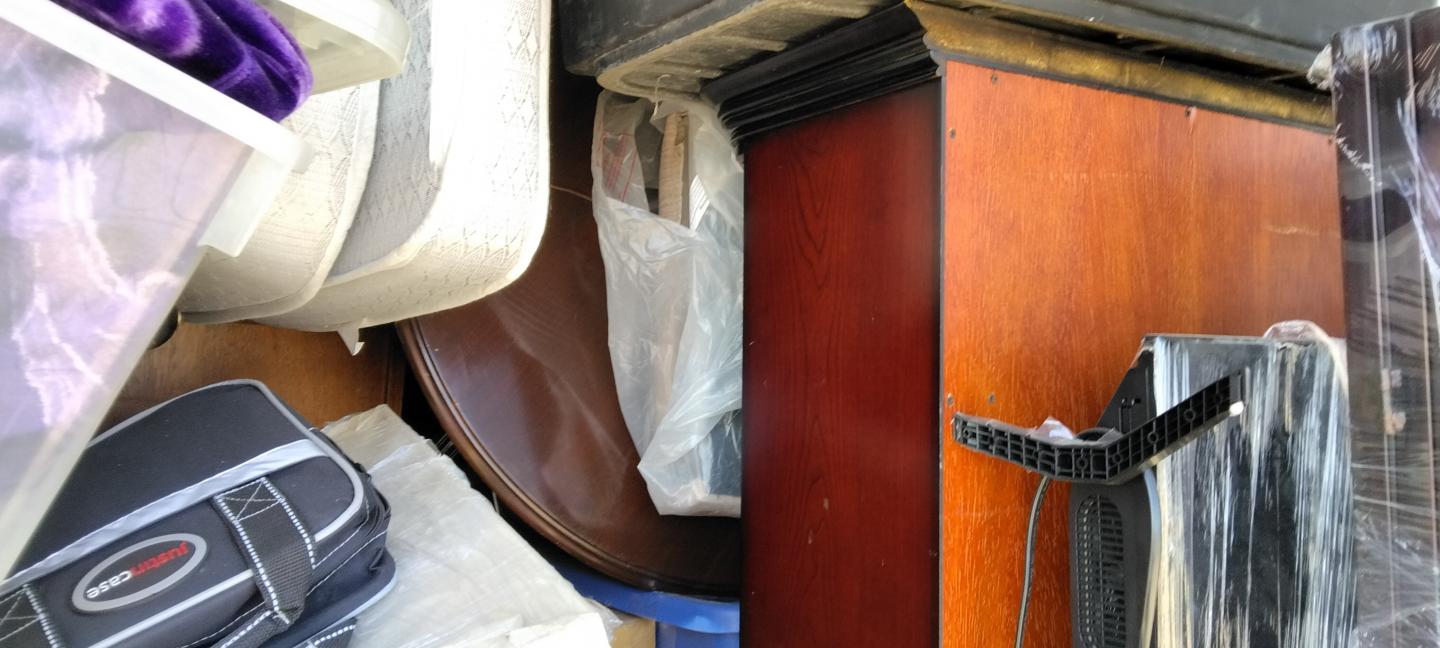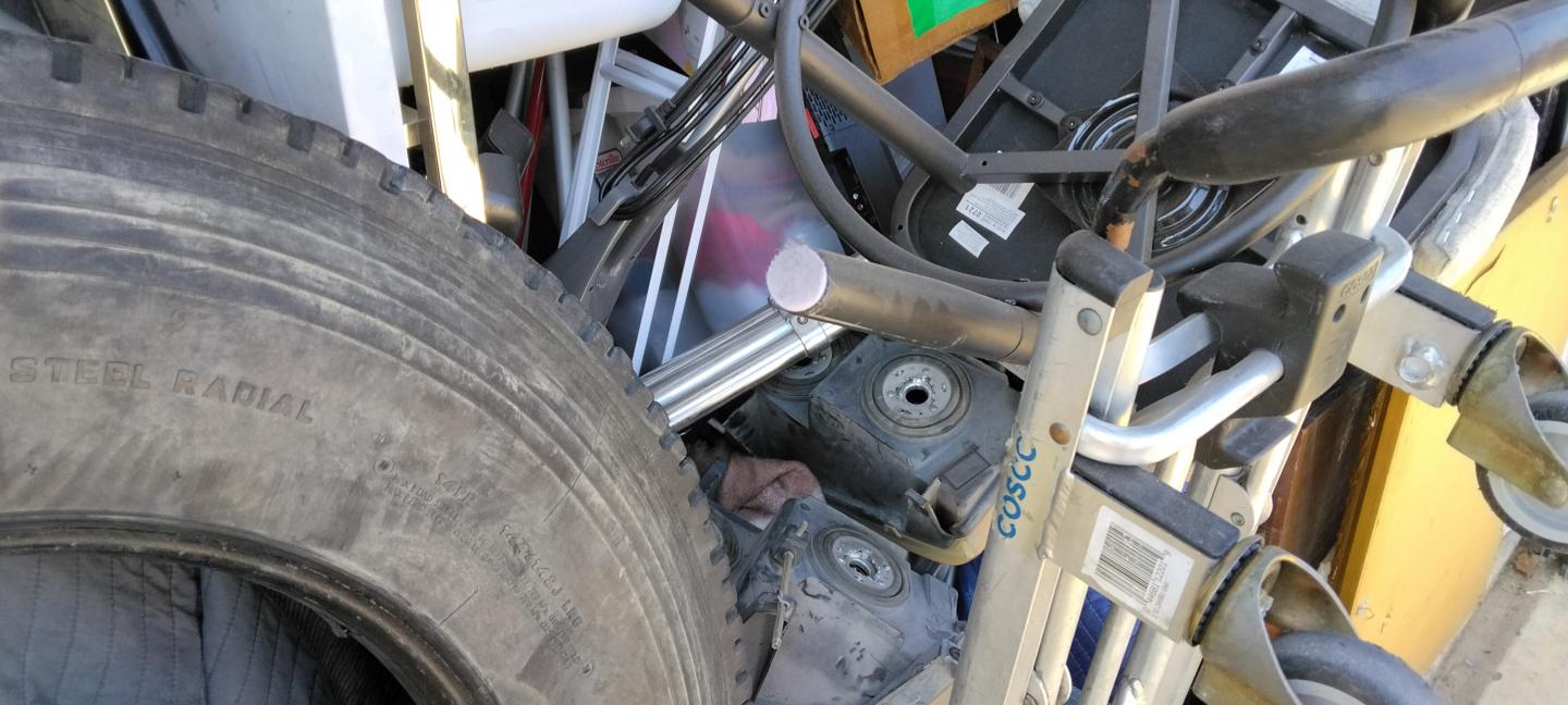 This unit appears to contain…tires, misc. art, misc. hand trucks, misc. furniture, misc. electronics, misc. heavy equipment, misc. totes, golf clubs, horse saddle, misc. household items, misc. office furniture