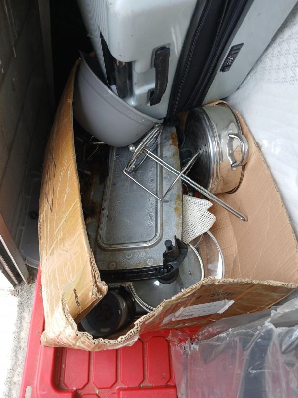 This unit appears to contain…box springs, mattress,suitcases, pots and pans, headboard, totes, pictures,