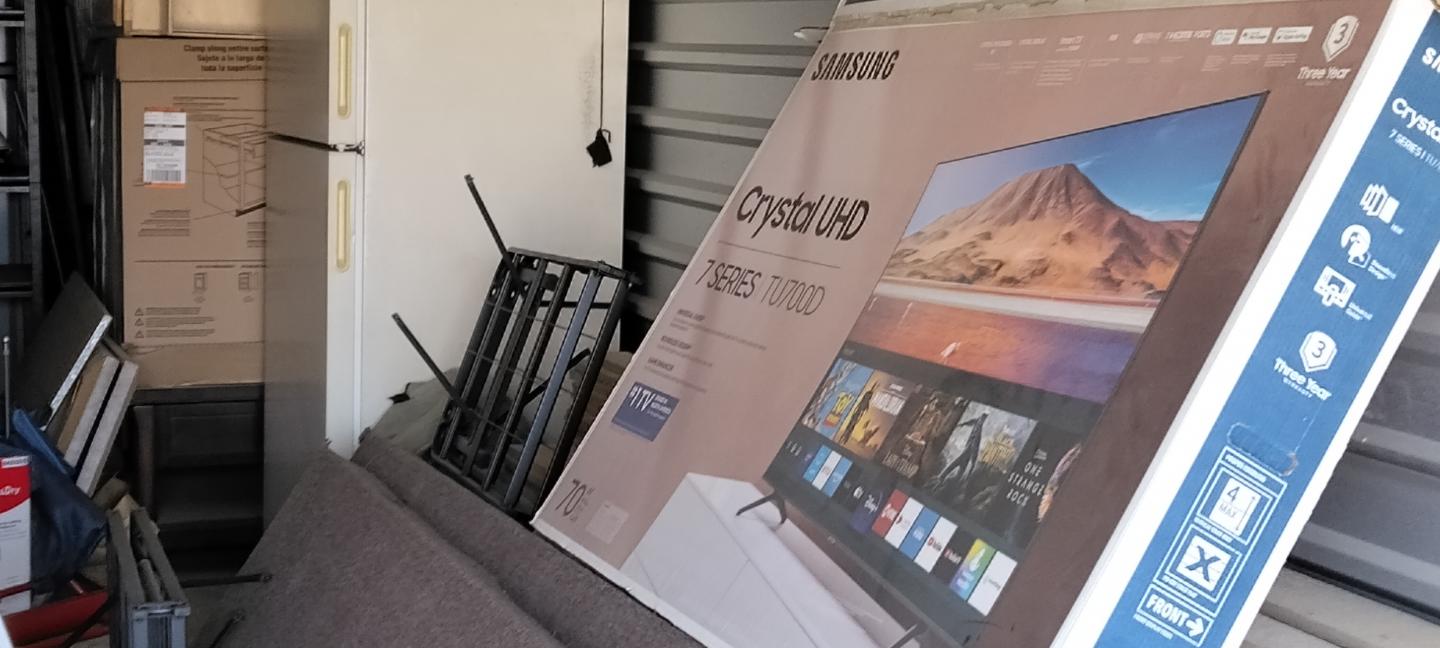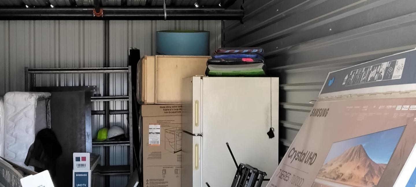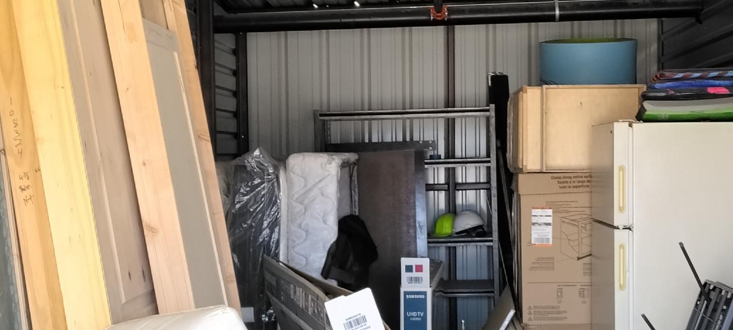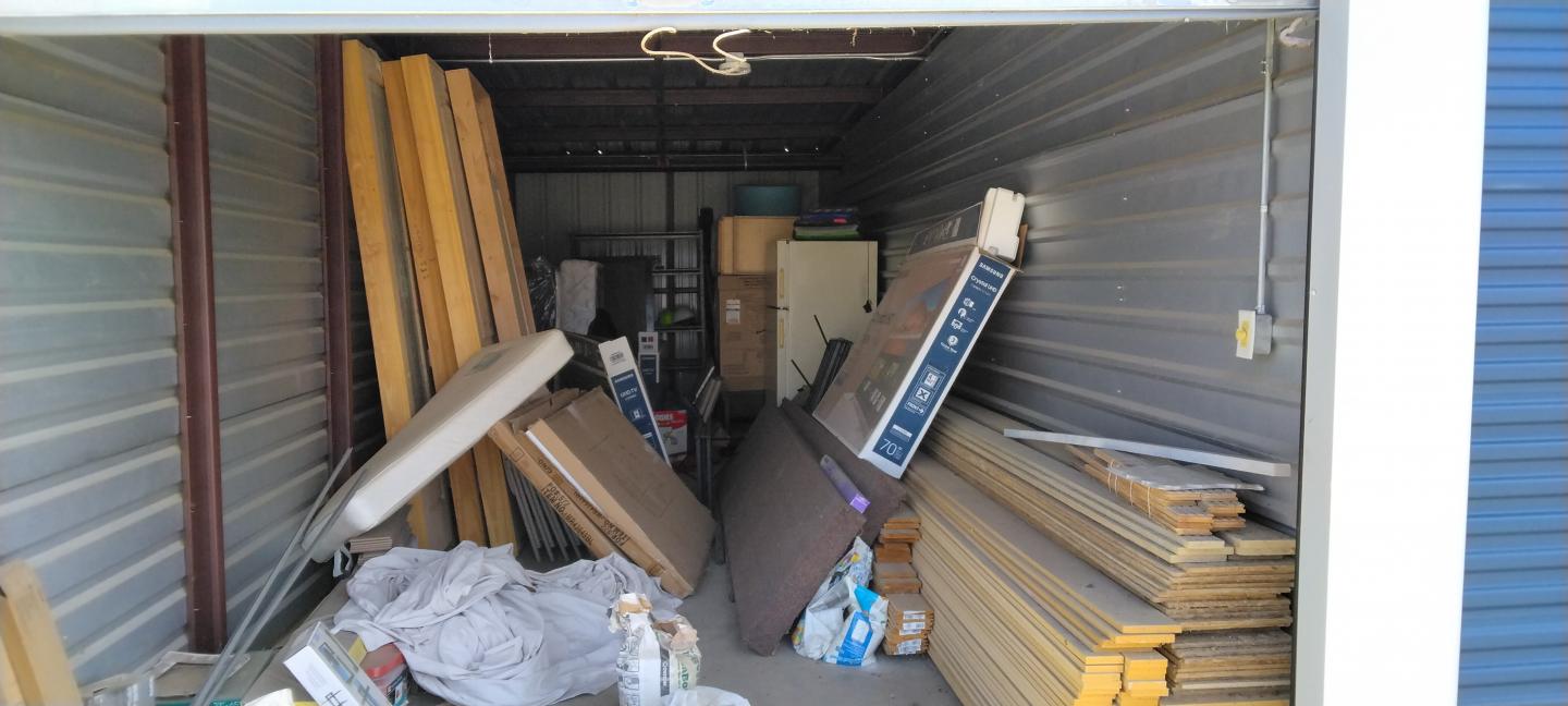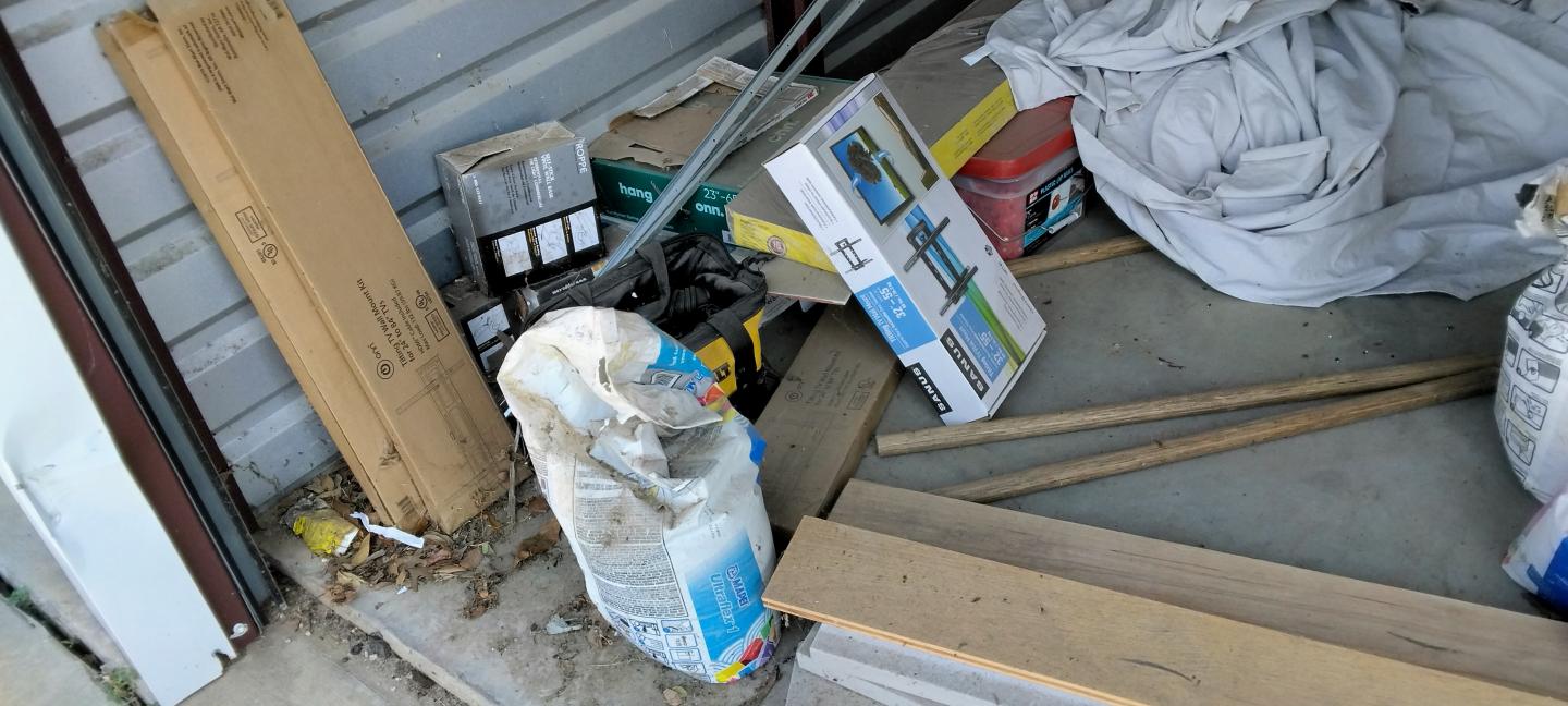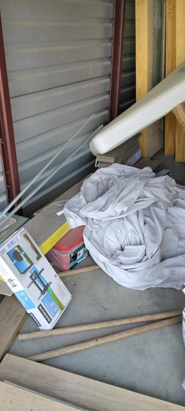 This unit appears to contain…misc. building materials, misc. lumber, misc. wall mounts, misc. dewalt tools, misc. doors, misc. flooring, shelving, misc. cabinets, misc. foam, refrigerator, misc. mattresses,