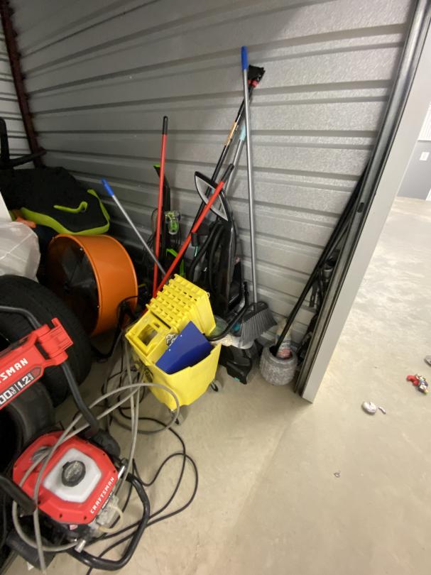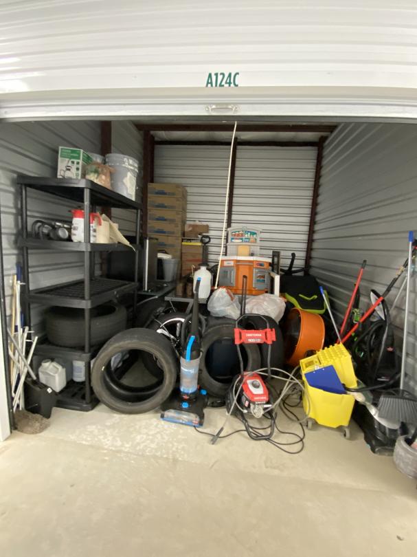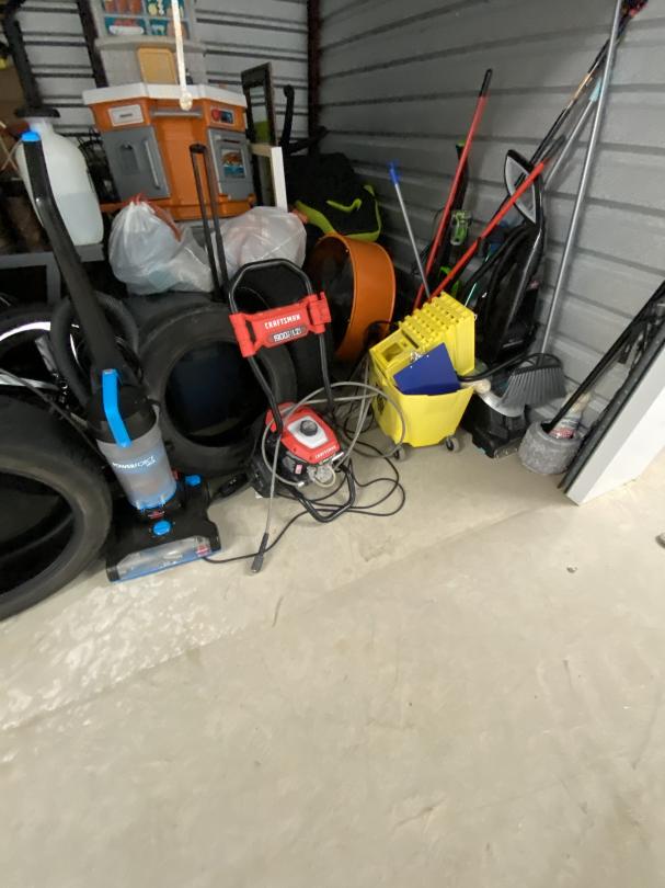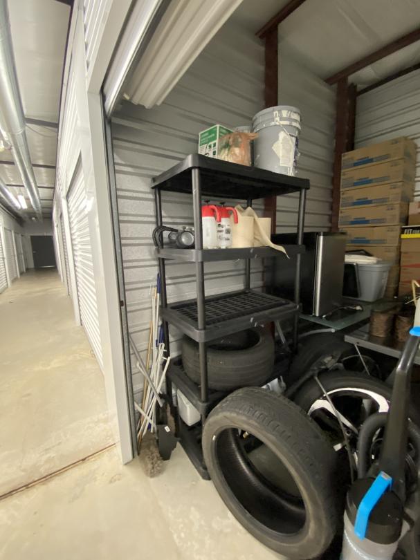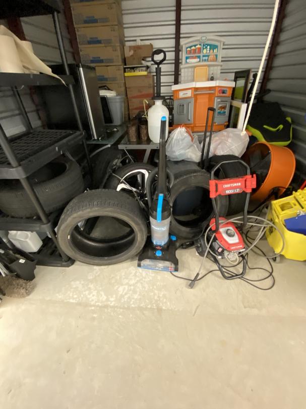 This unit appears to contain…Tires, rims, cleaning items & tools, miscellaneous items