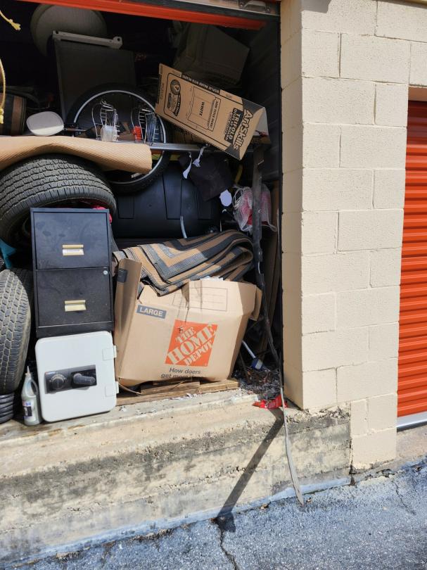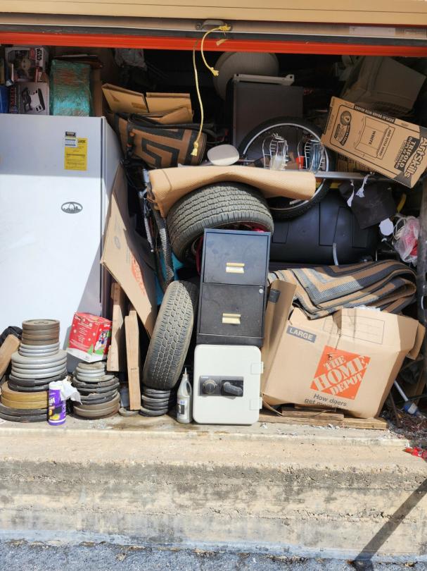 This unit appears to contain…SAFE, FILING CABINET, TIRES, WEIGHTS, BOXES, UPRIGHT FREEZER, TOTES, STAR WARS COLLECTIBLE, BIKE, RUGS, FURNITURE