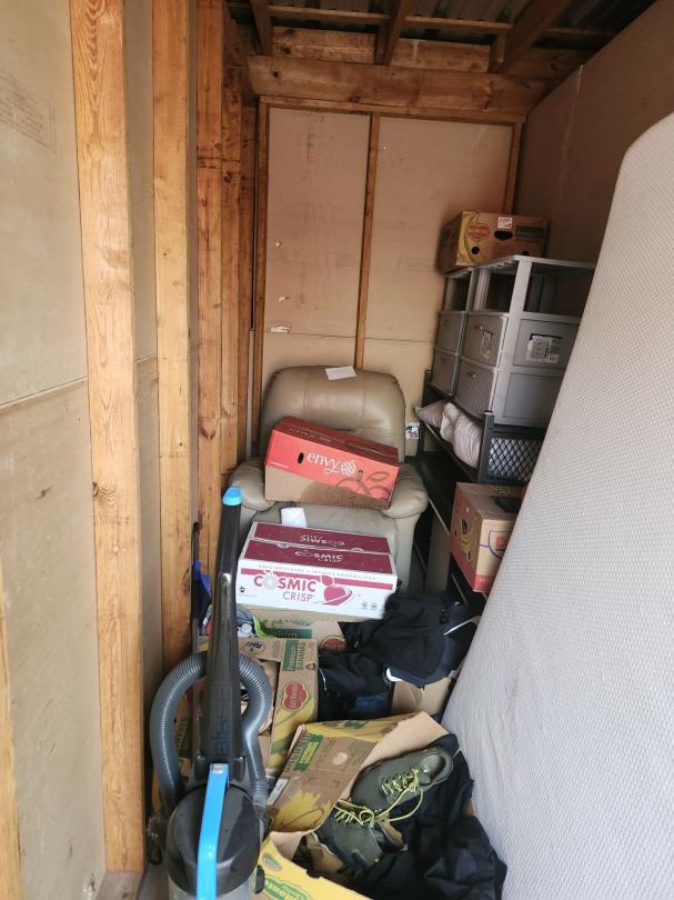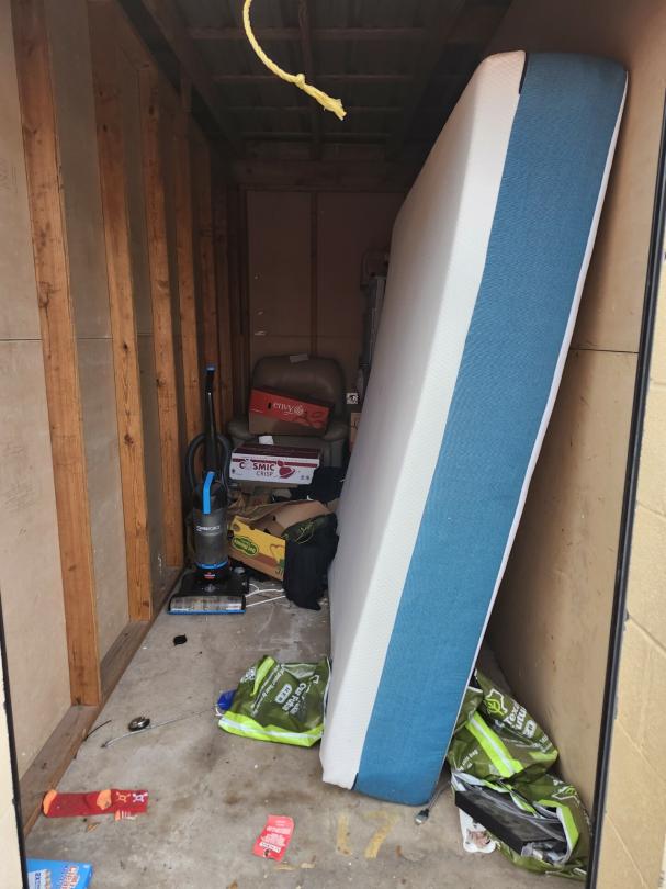 This unit appears to contain…SHELVES, PLASTIC STORAGE DRAWERS, RECLINER, MATTRESS, BOXES, VACUUM, SHOES, CLOTHING