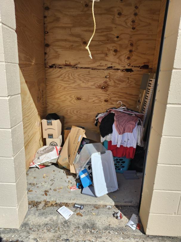 This unit appears to contain…CLOTHES, BOXES, KEYBOARD, TOTES, LAUNDRY BASKET