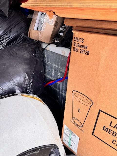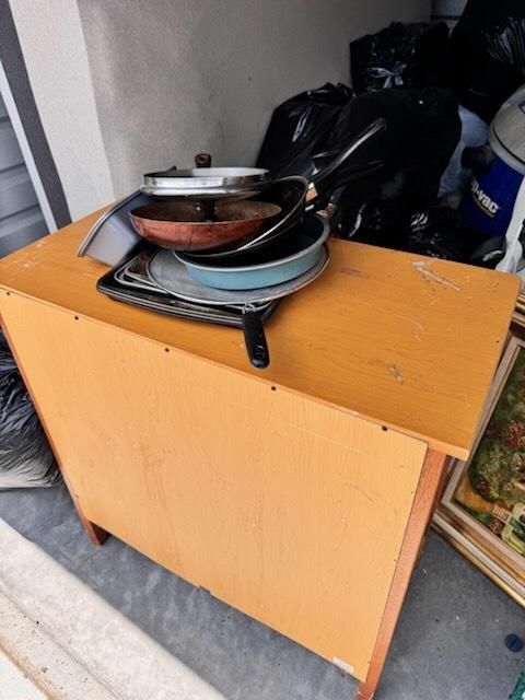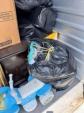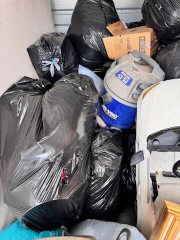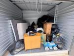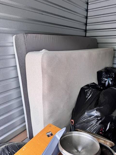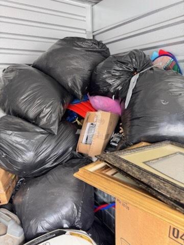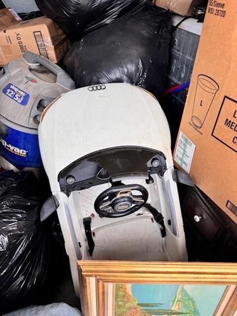 This unit appears to contain…multiple plastic bags, baby scooter, pans, folding chair, pictures, shop-vac,mattress, small desk,nightstand