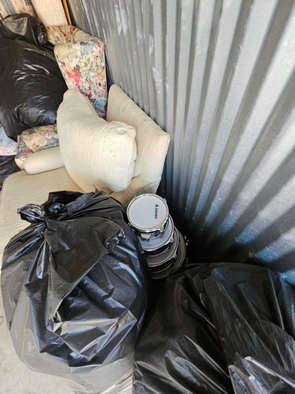 This unit appears to contain… Chair, Bags of items, Mattress and Box Spring, drums