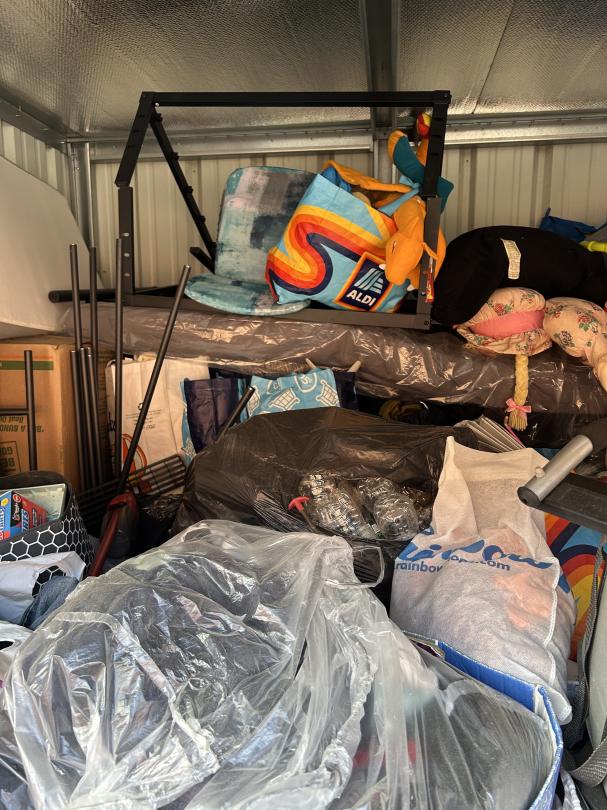 This unit appears to contain…READ ALL AUCTION RULES BEFORE BIDDING!!! Unit appears to contain: TV boxes, clothes, bags, boxes, shoes, dressers, board games, dumbbell weights, side table