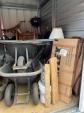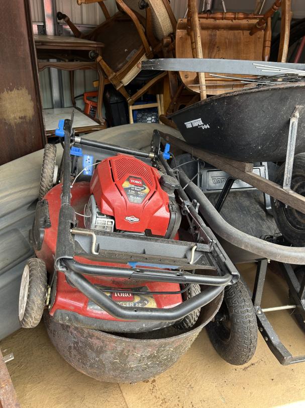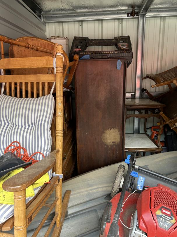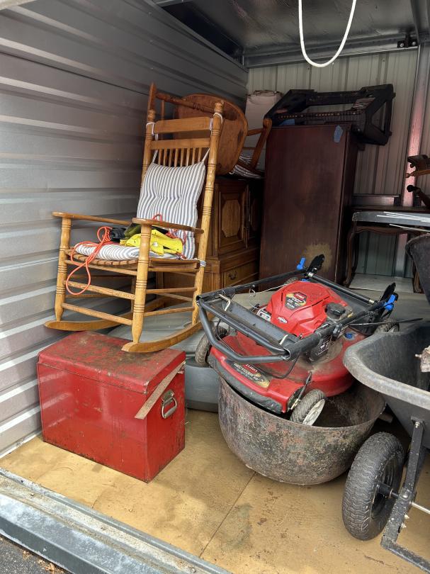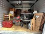 This unit appears to contain…READ ALL AUCTION RULES BEFORE BIDDING!!! Unit appears to contain: wheelbarrow, tools, tool box, grill, lawn mower, chairs, rocking chair, possible canoe/paddle board