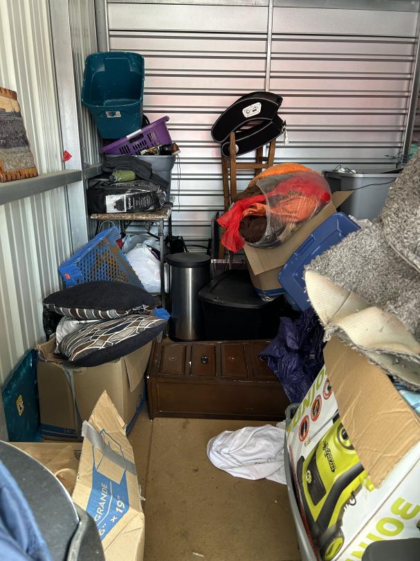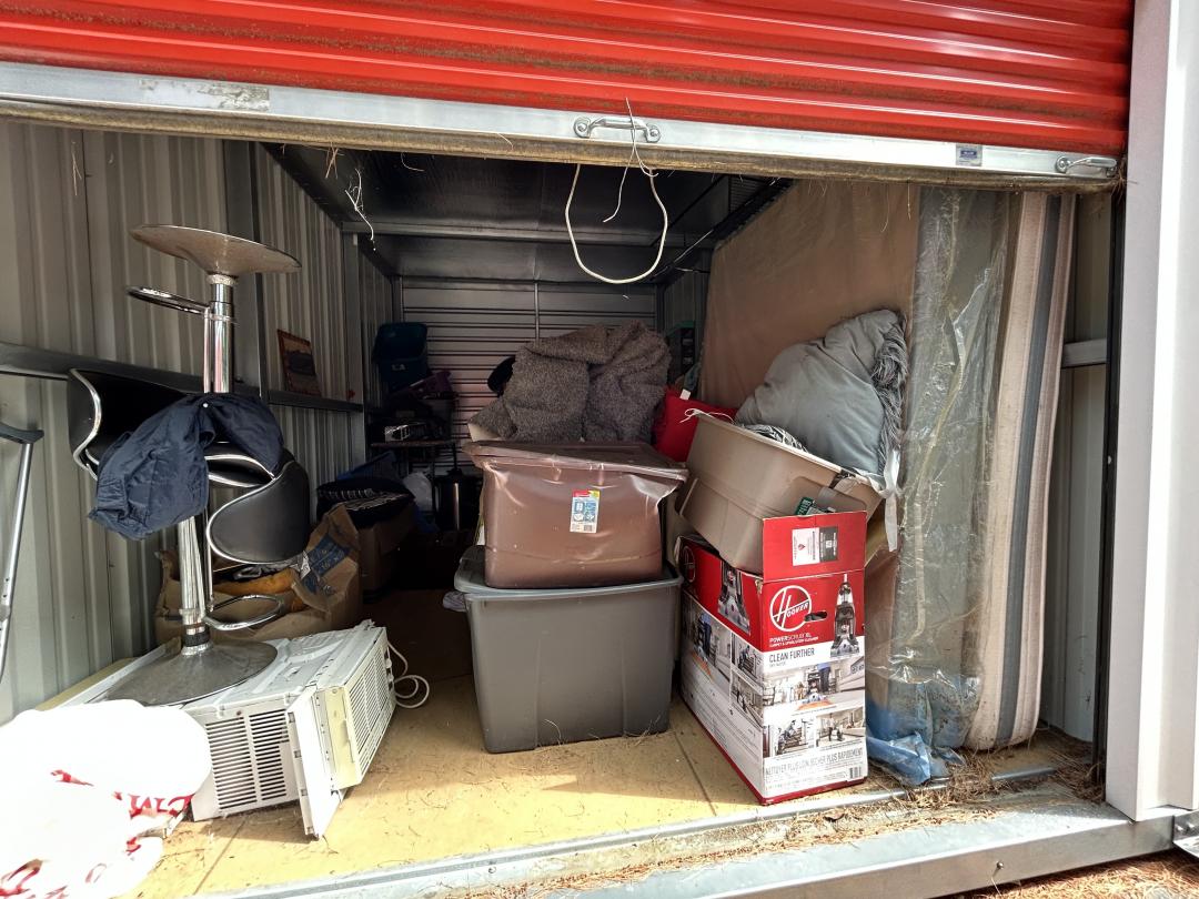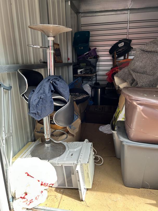 This unit appears to contain…READ ALL AUCTION RULES BEFORE BIDDING!!! Unit appears to contain: gaming chair, bar stools, totes, vacuum, chairs, tables, rack, pillows, rug, mattress, trash can, A/Cs