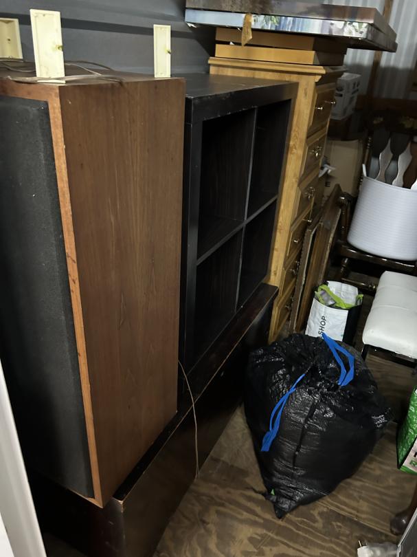 This unit appears to contain…READ ALL AUCTION RULES BEFORE BIDDING!!! Unit appears to contain: table, chairs, A/C, bag, boxes, electronics, dresser, speaker, wall art