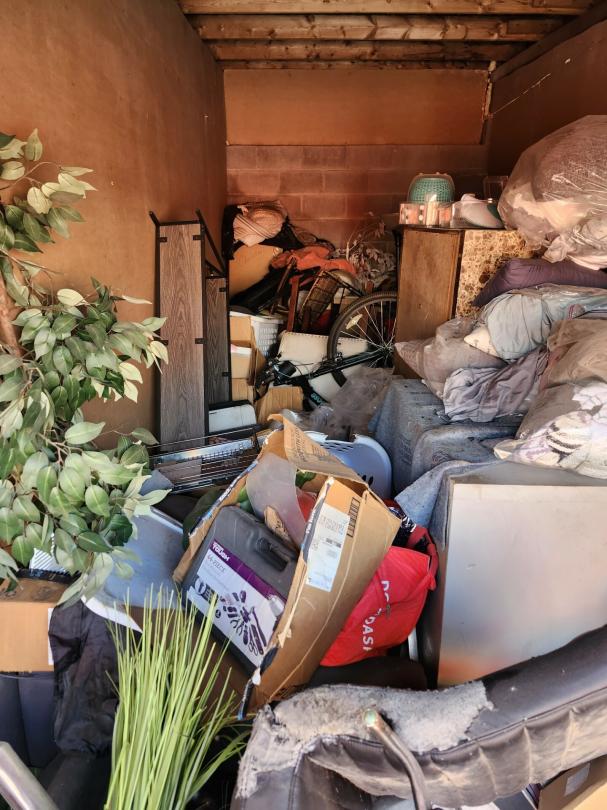 This unit appears to contain…BOXES, BIKE, FURNITURE, HOME DECOR, FAKE PLANTS, TOOLS, CHAIR