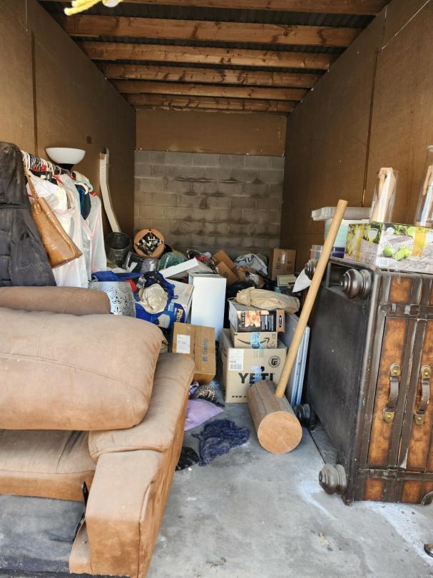 This unit appears to contain…COFFEE TABLE, BOXES, LARGE WOODEN MALLET, RECLINER, CLOTHING, HOME DECOR